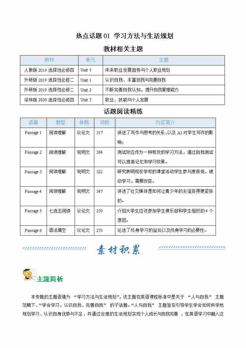 热点话题01 学习方法与生活规划(话题阅读精练)(教师版