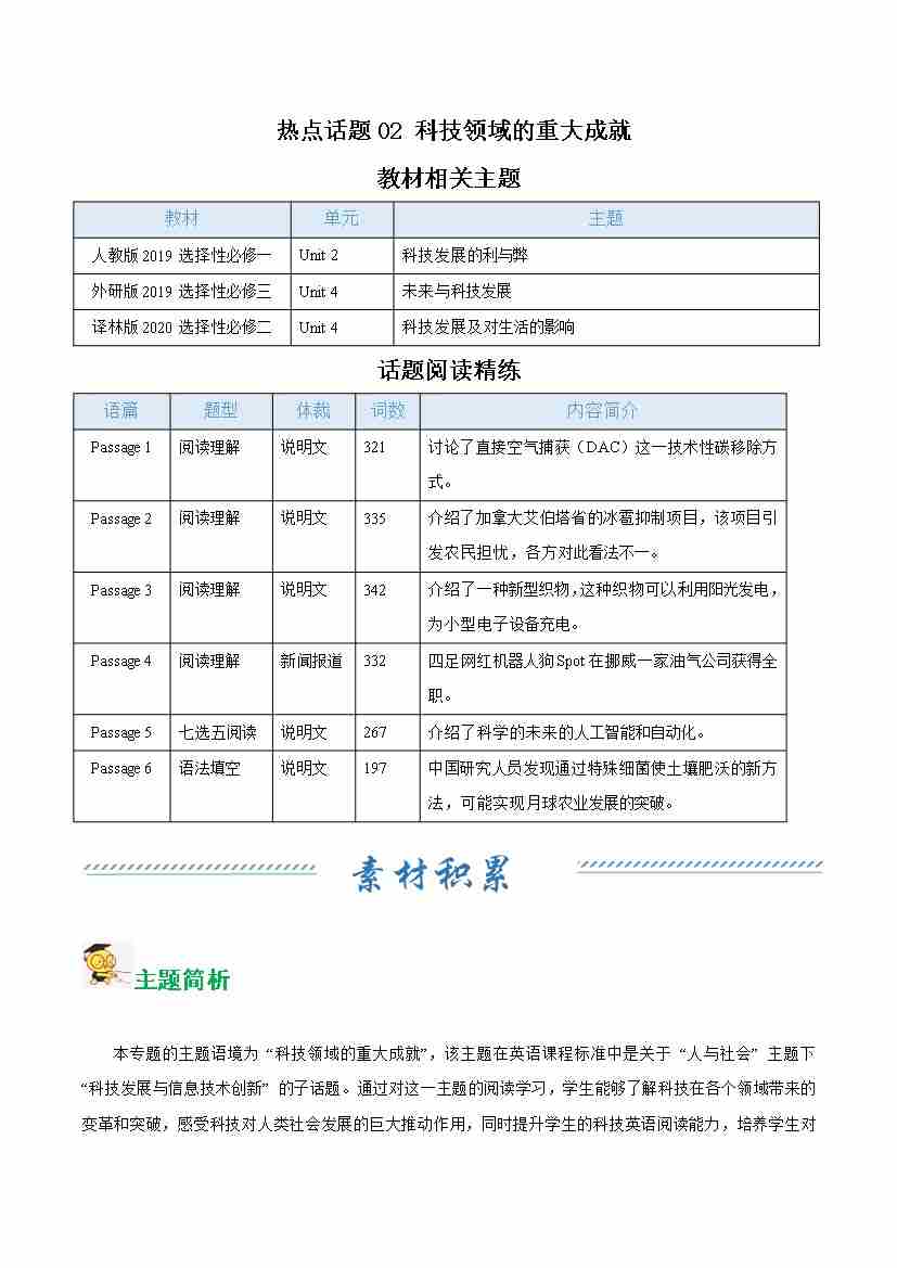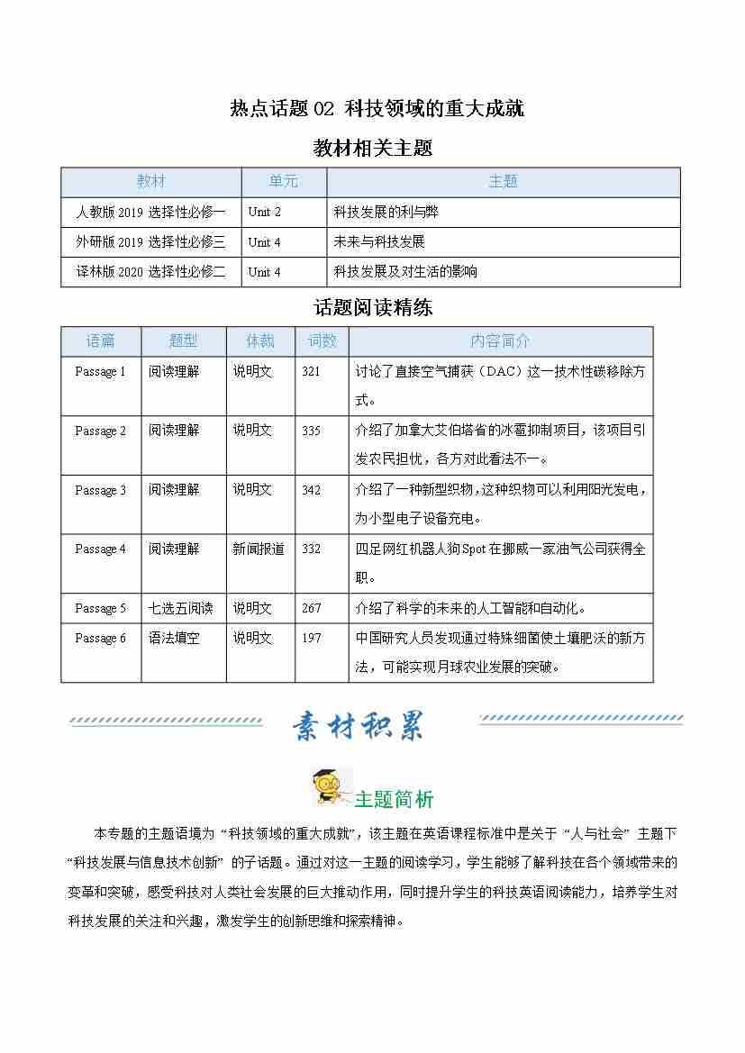 热点话题02 科技领域的重大成就(话题阅读精练)(学生版