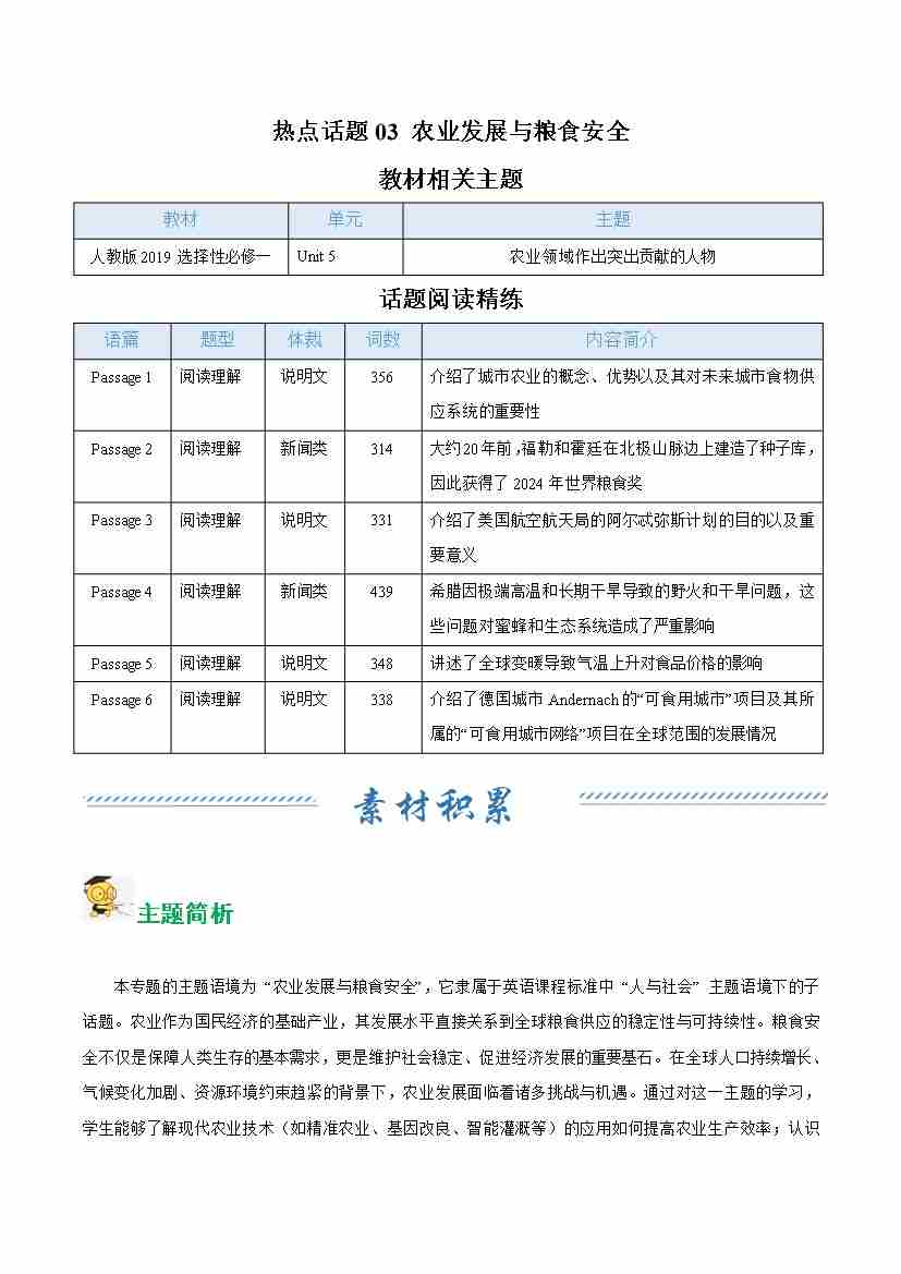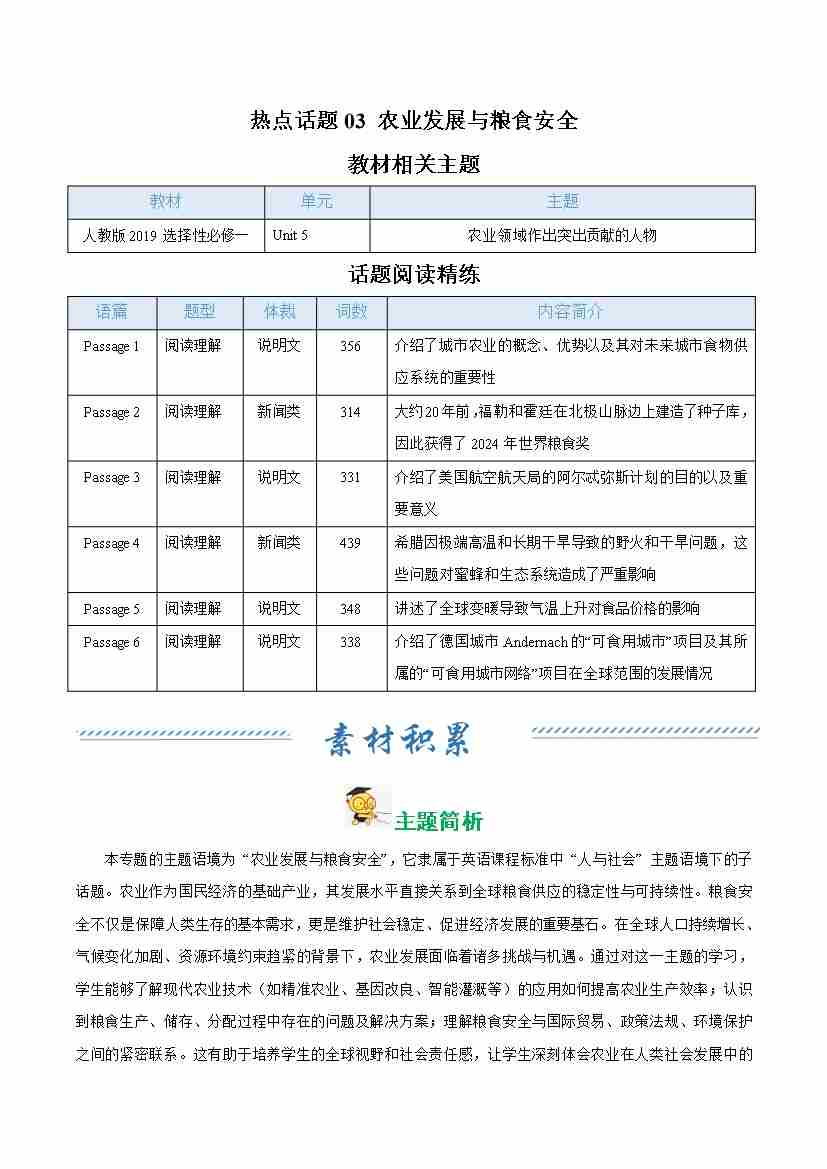 热点话题03 农业发展与粮食安全(话题阅读精练)(学生版