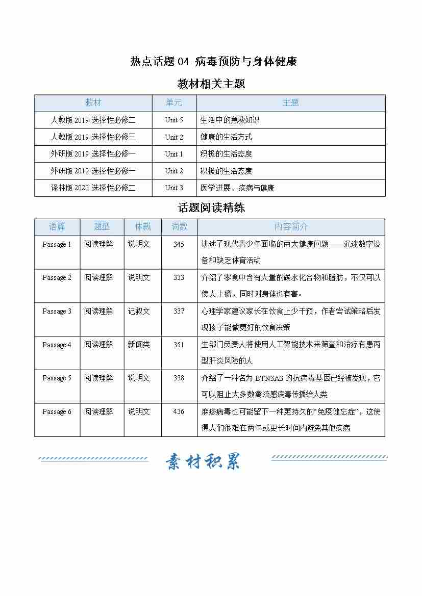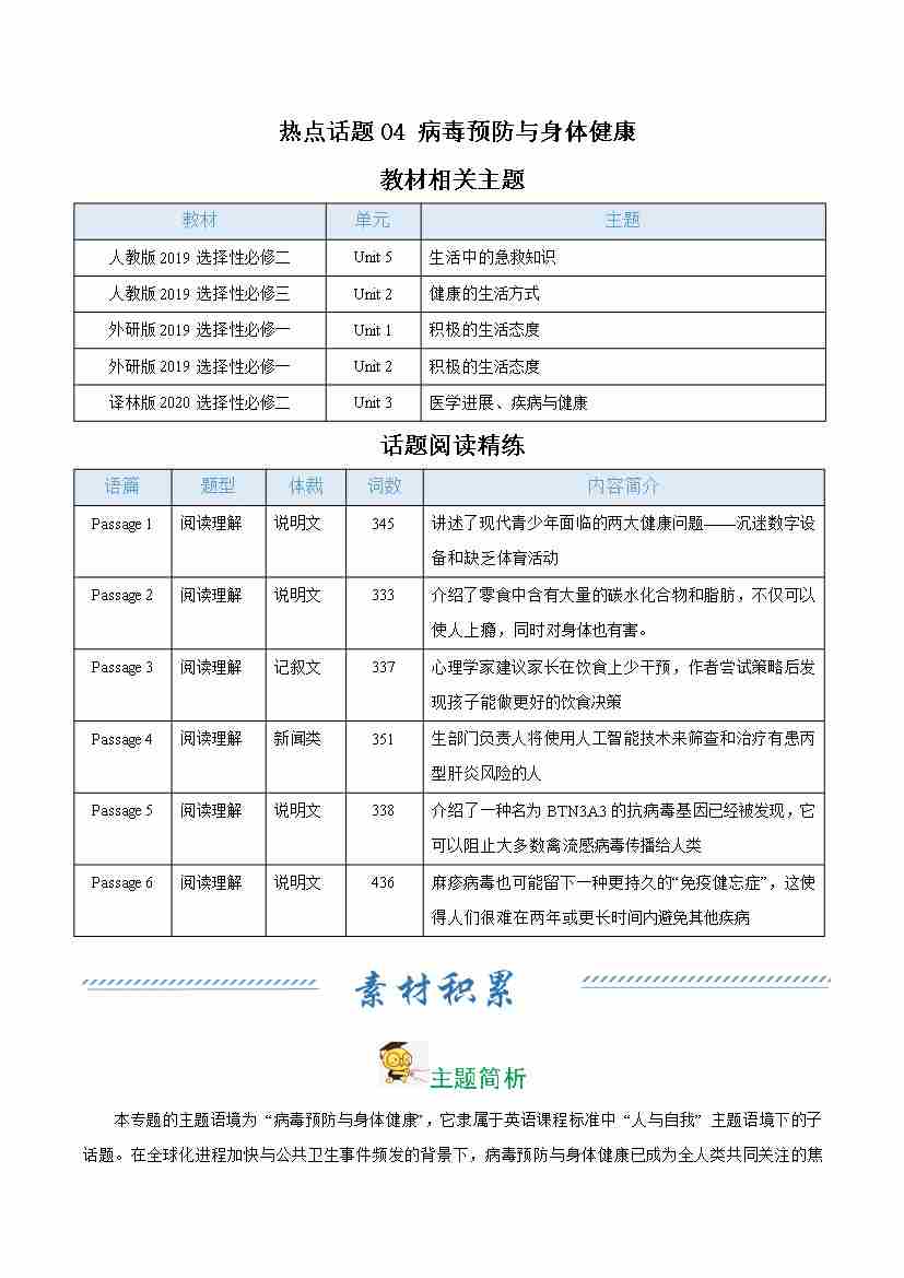 热点话题04 病毒预防与身体健康(话题阅读精练)(学生版