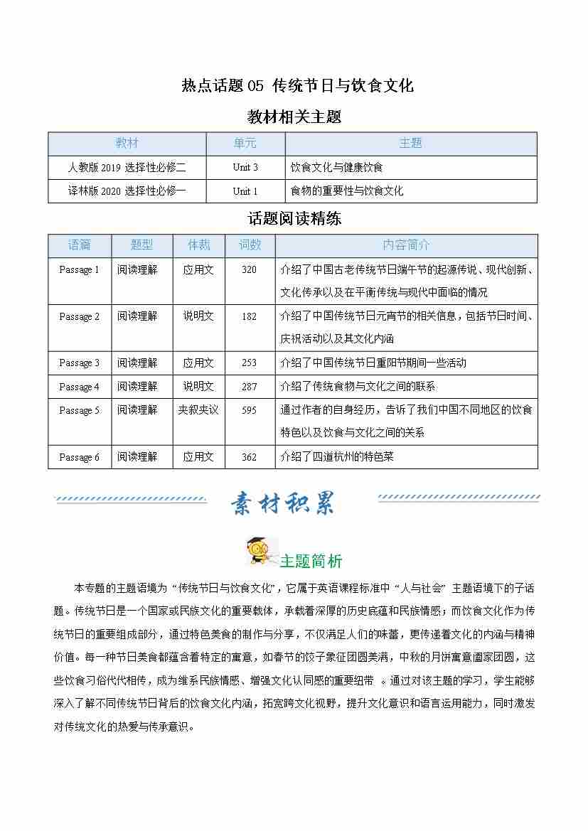 热点话题05 传统节日与饮食文化(话题阅读精练)(教师版