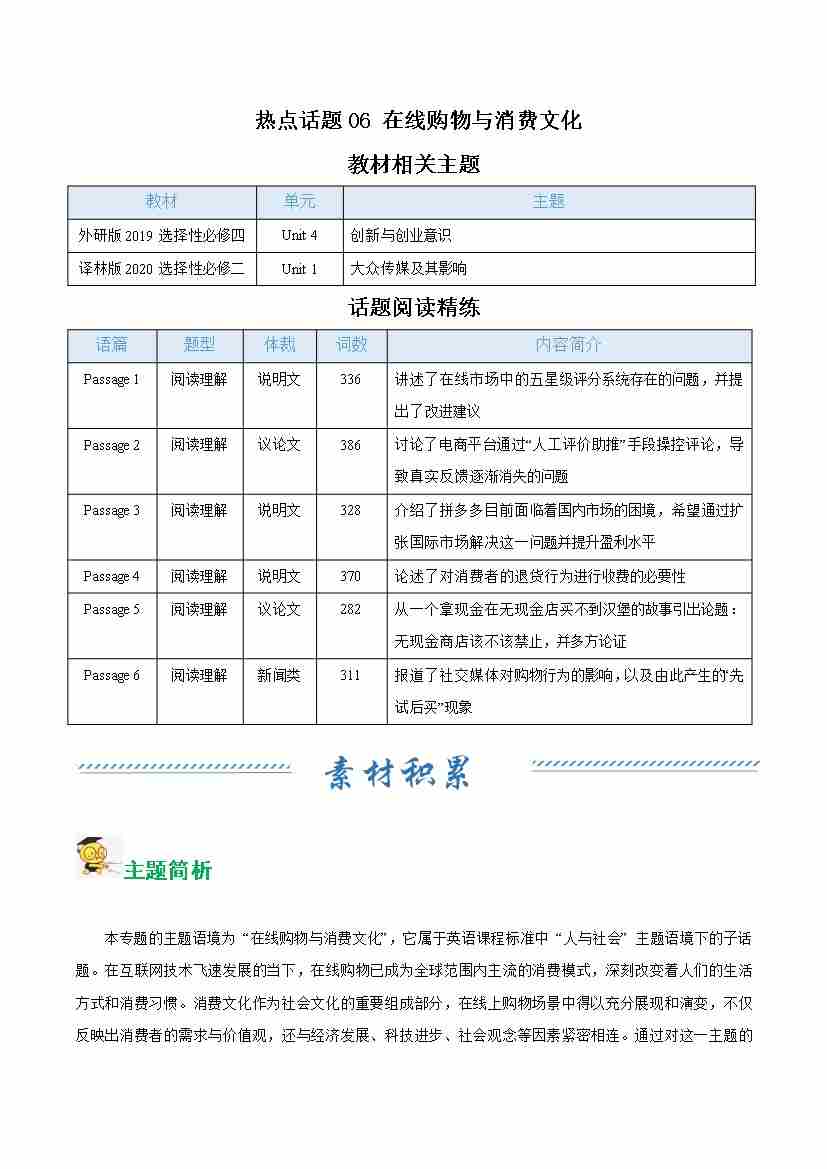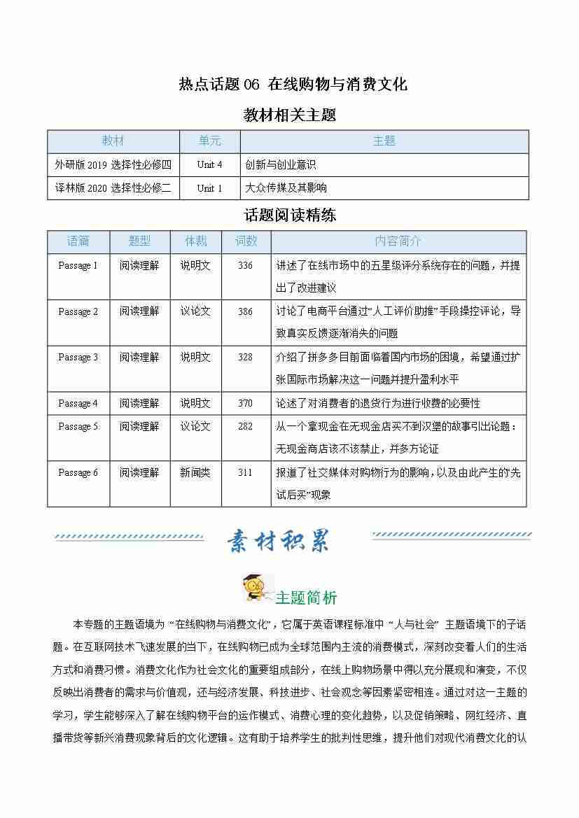 热点话题06 在线购物与消费文化(话题阅读精练)(学生版