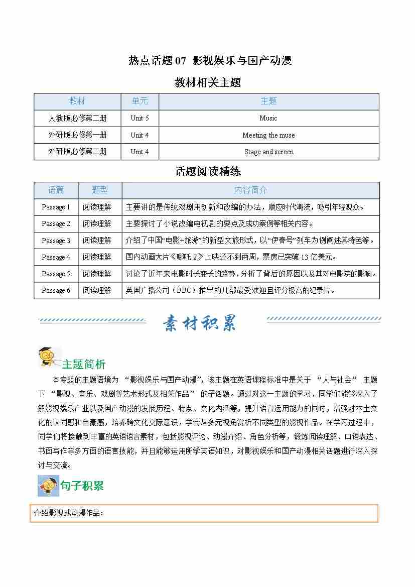 热点话题07 影视娱乐与国产动漫(话题阅读精练)(学生版