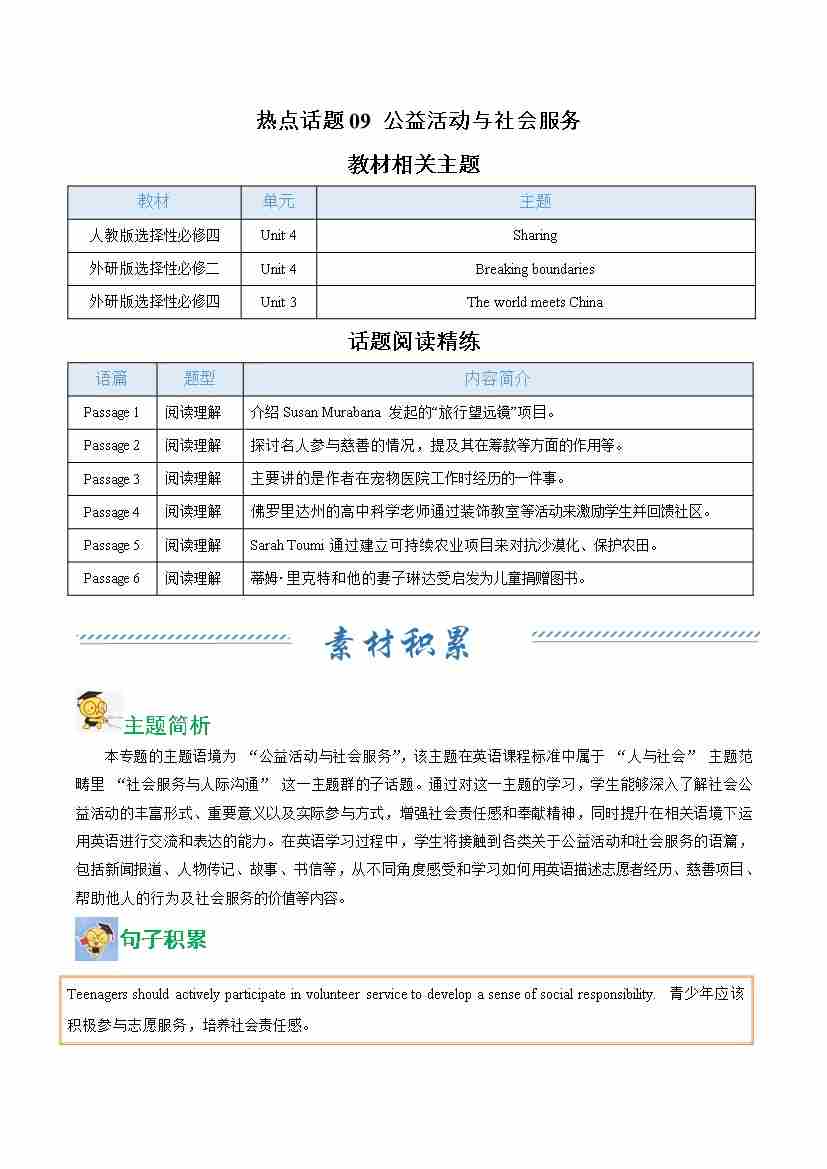 热点话题09 公益活动与社会服务(话题阅读精练)(教师版