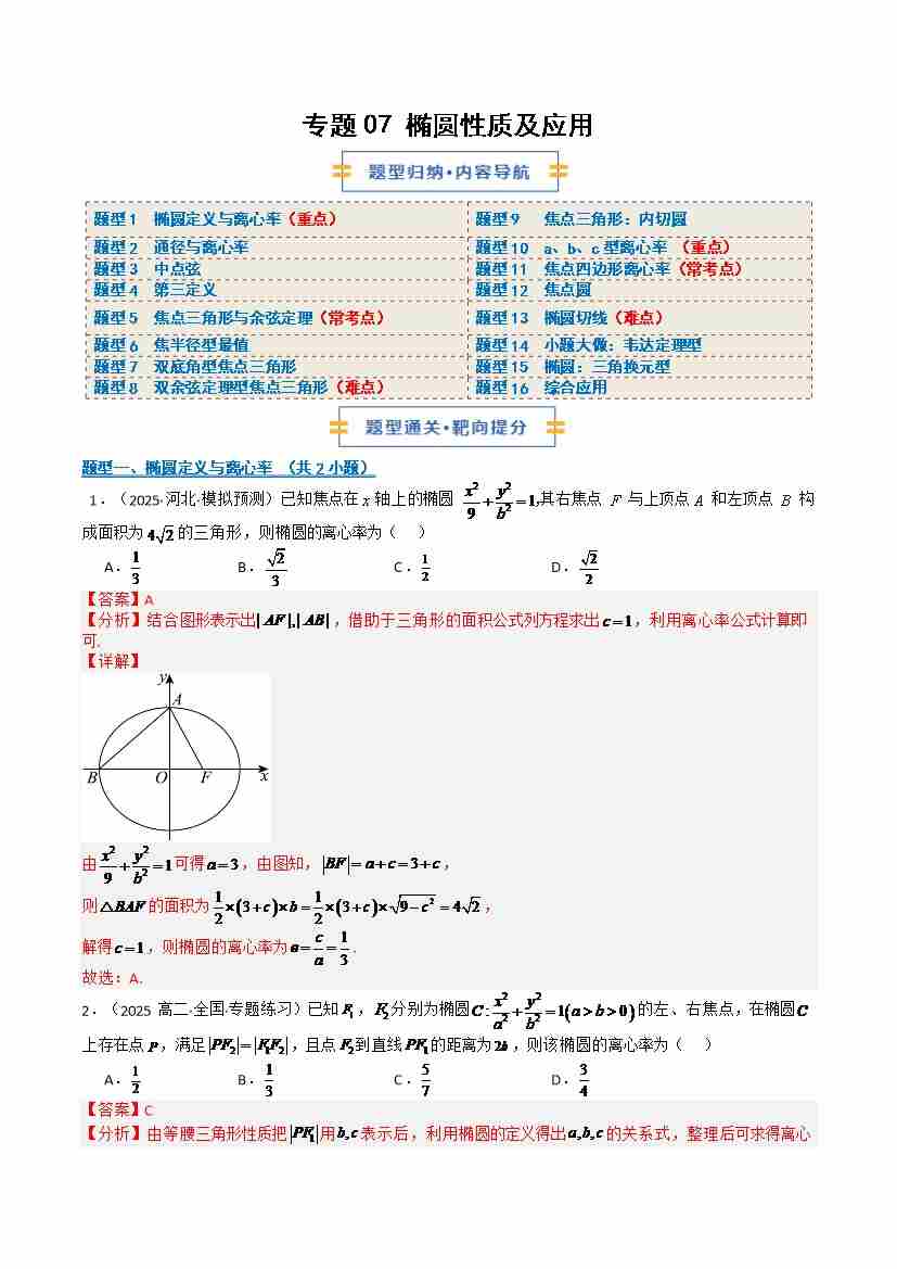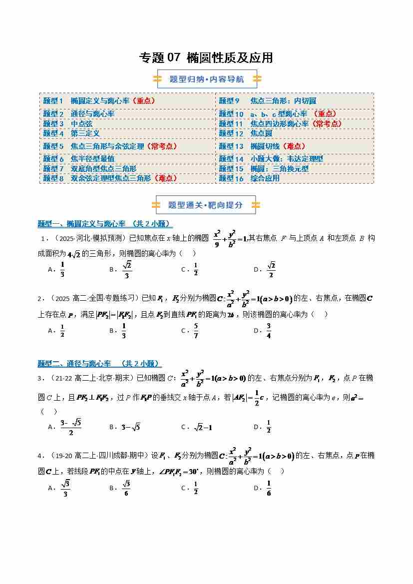 专题07 椭圆性质及应用 (期中专项训练)(学生版)