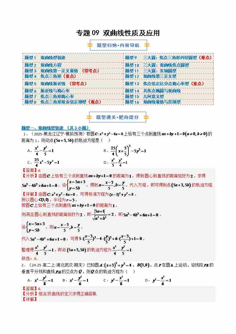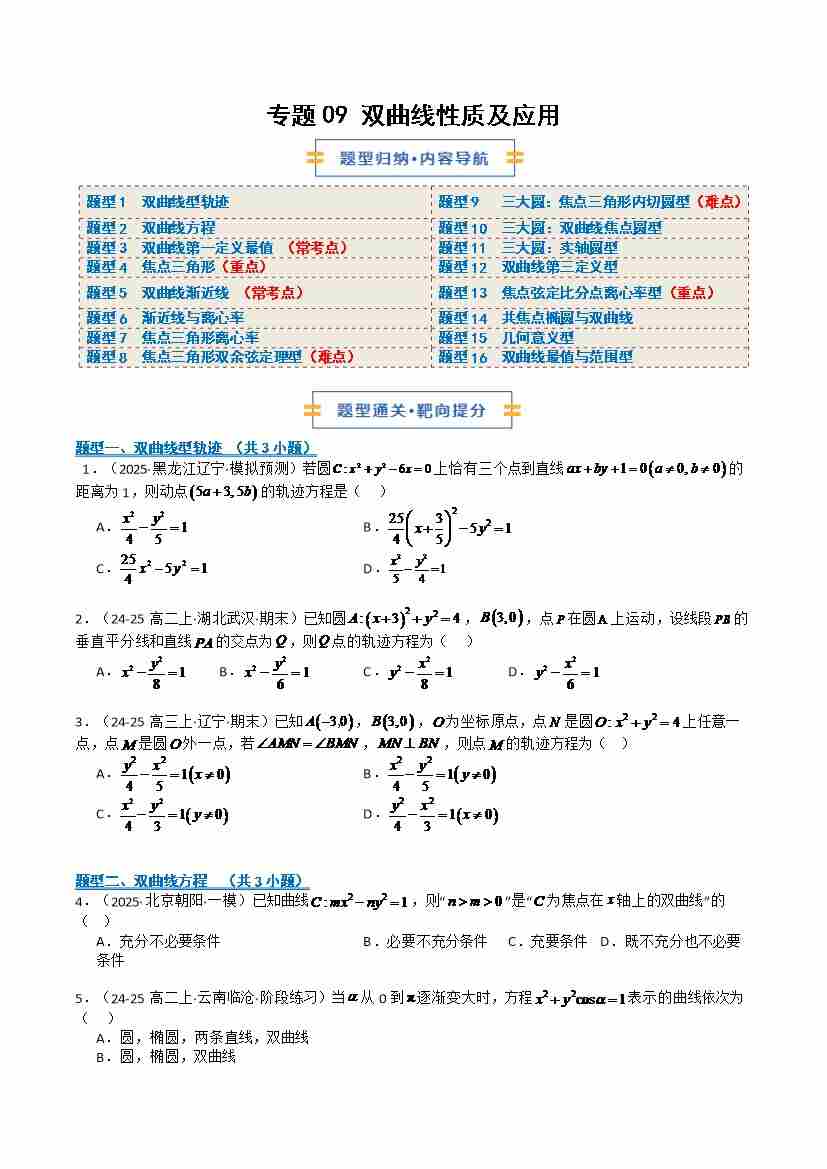 专题09 双曲线性质及应用(期中专项训练)(学生版)