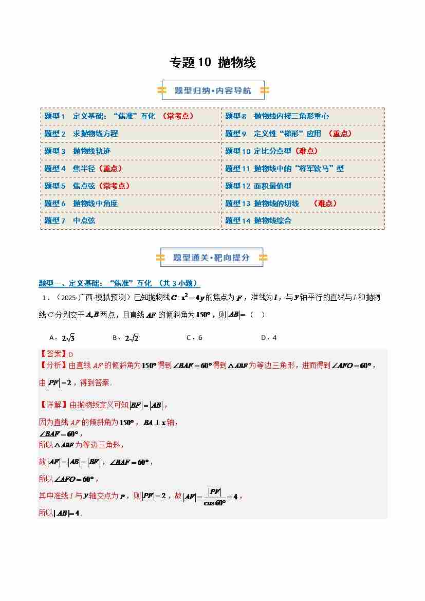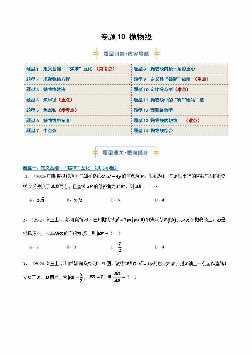 专题10抛物线(期中专项训练)(学生版)