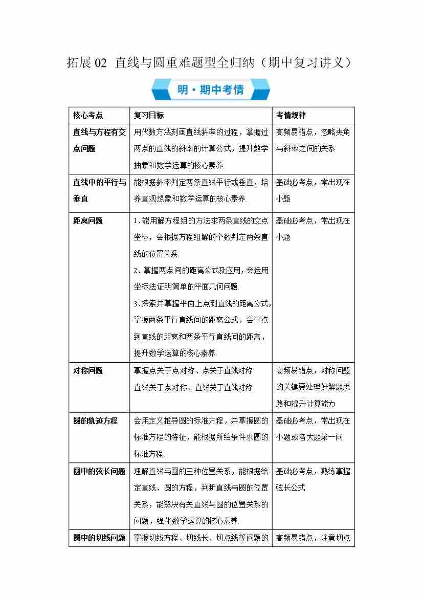 拓展02 直线与圆重难题型全归纳(期中复习讲义核心10大题型)(学生版)