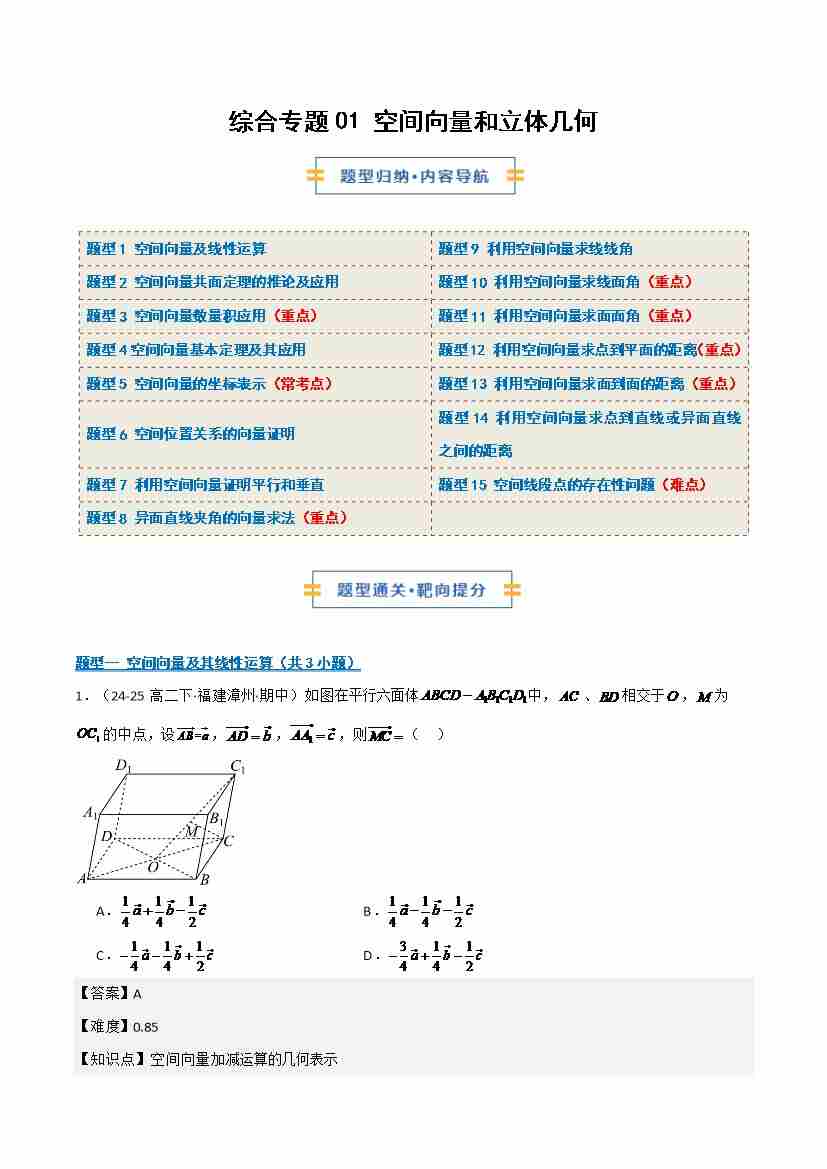 综合专题01 空间向量与立体几何15题型整章复习(期中专项训练)(学生版)