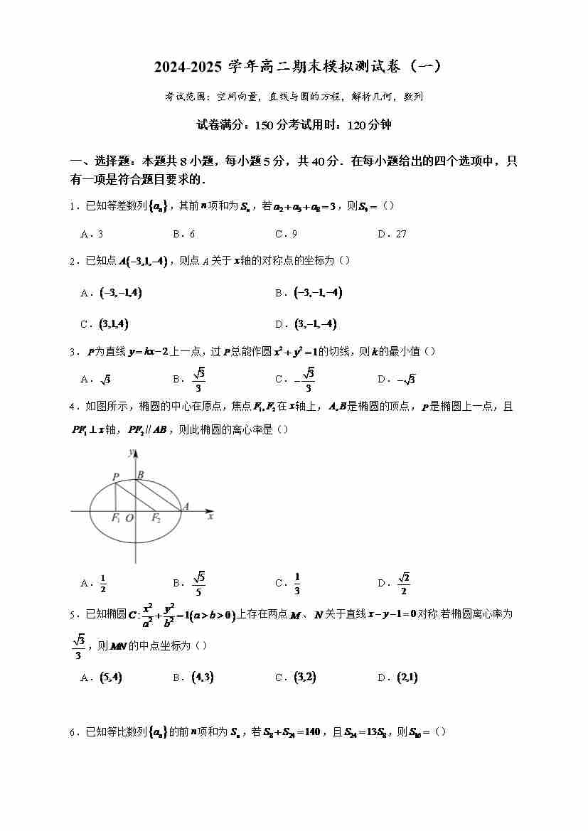 高二数学上学期期末考前必刷押题卷01(范围:选择性必修第一册+数列)(学生版)