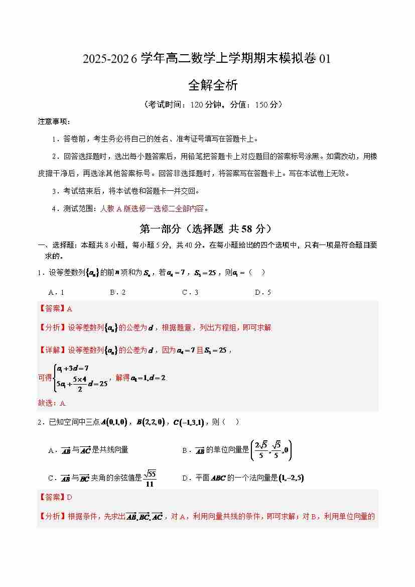 高二数学期末模拟卷01(全解全析)(人教A版)