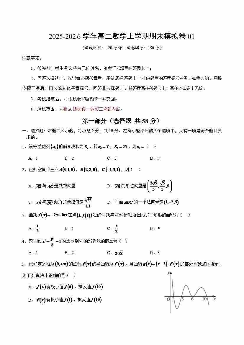 高二数学期末模拟卷01(测试范围:人教A版选修一选修二全部内容)(考试版A4)