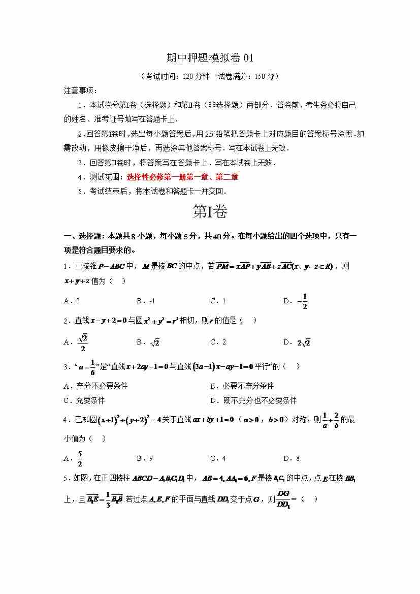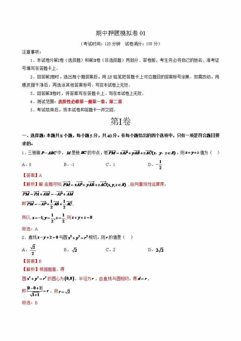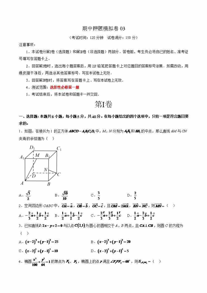 期中押题模拟卷02(测试范围:选择性必修第一册第一、二章+3.1椭圆)(学生版)