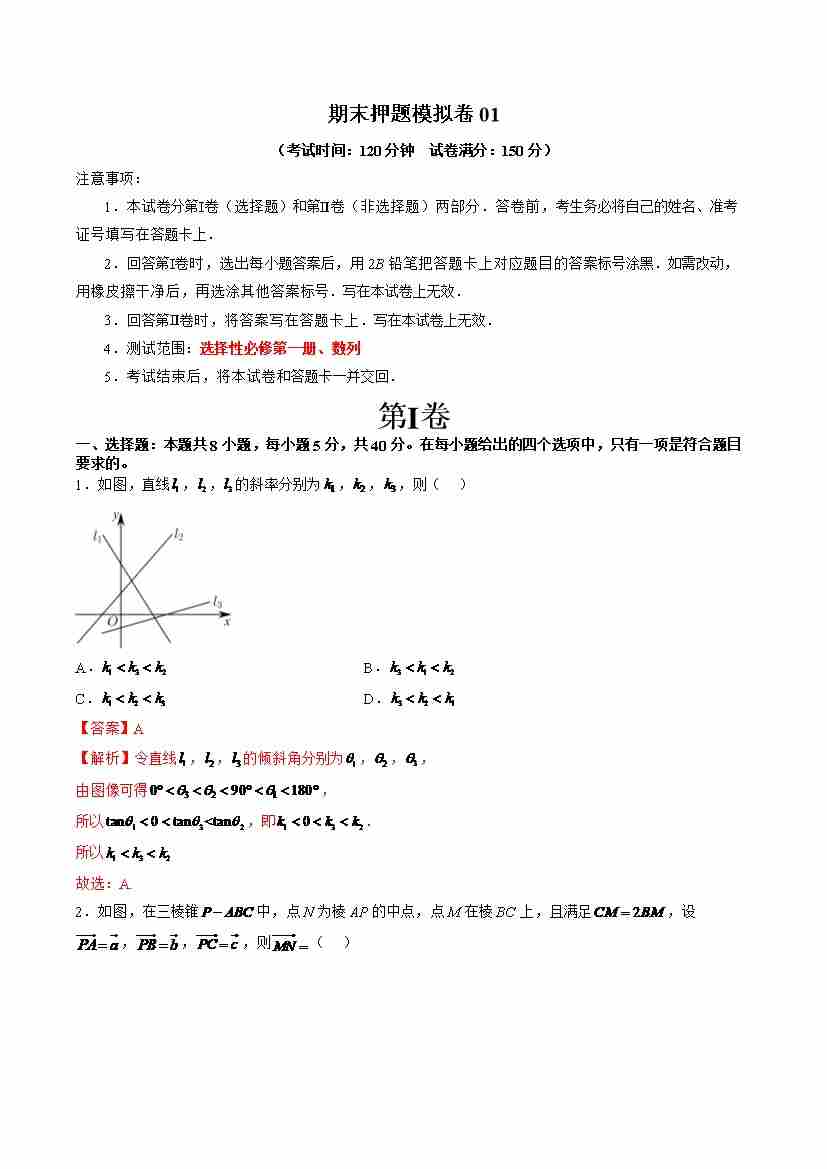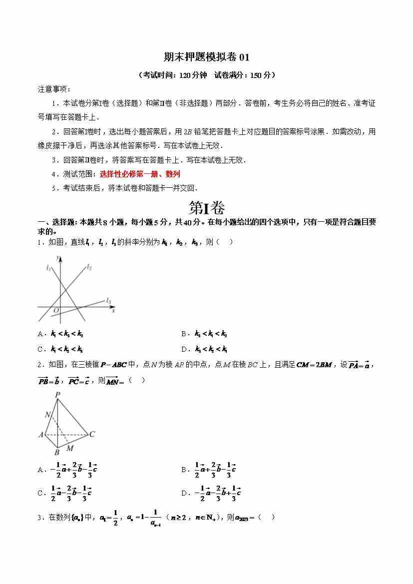 期末押题模拟卷01(测试范围:选择性必修第一册、数列)(学生版)