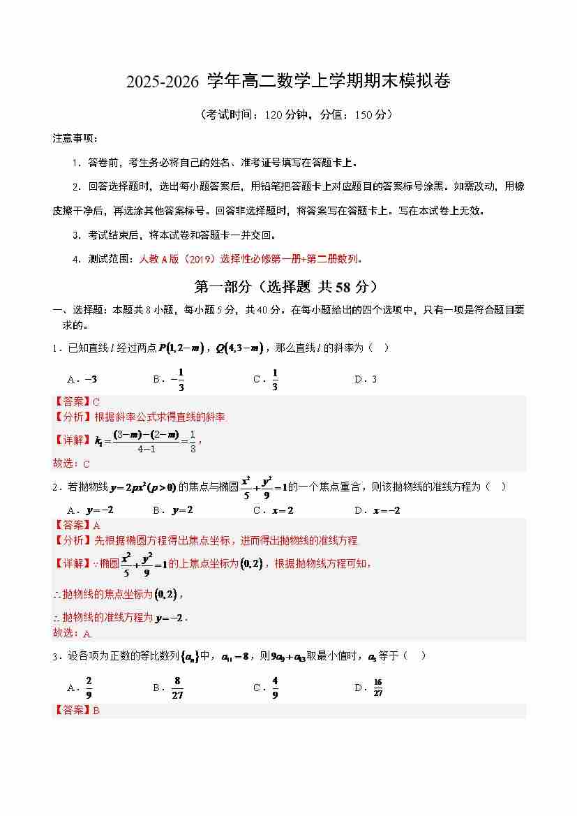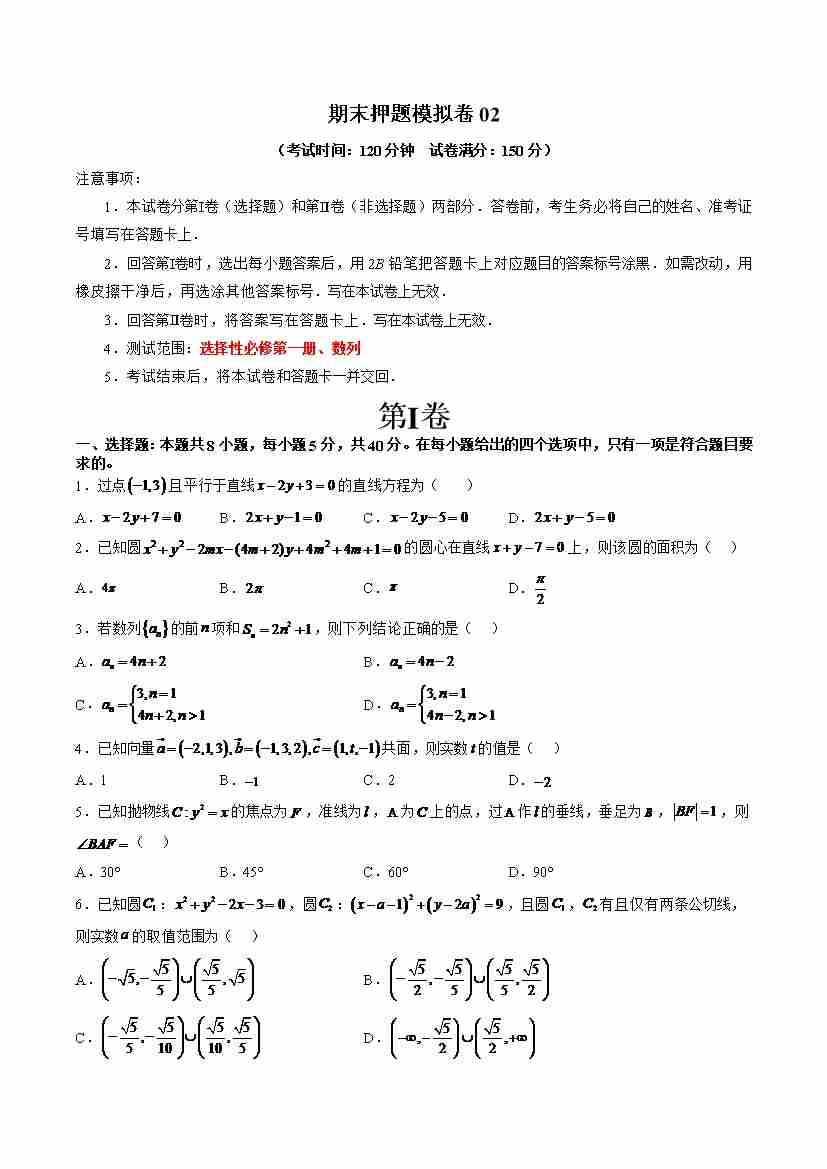 期末押题模拟卷02(测试范围:选择性必修第一册、数列)(学生版)