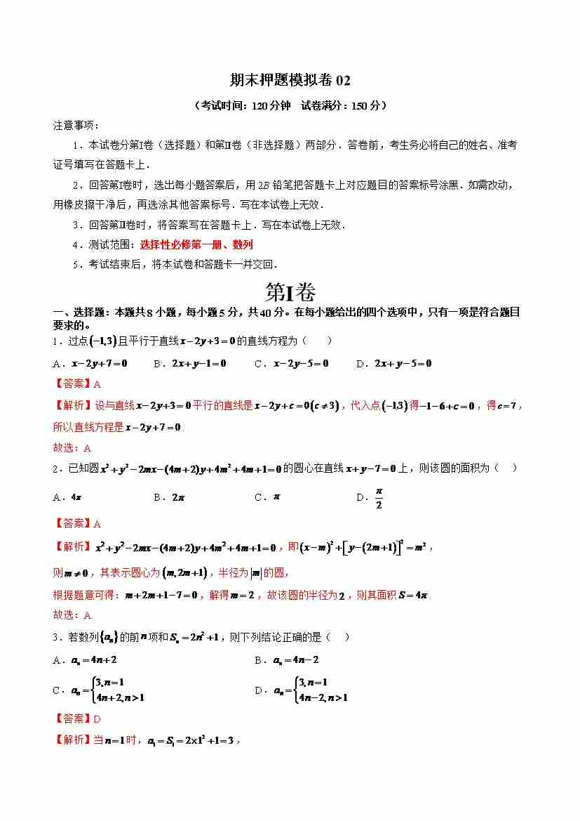 期末押题模拟卷02(测试范围:选择性必修第一册、数列)(教师版)