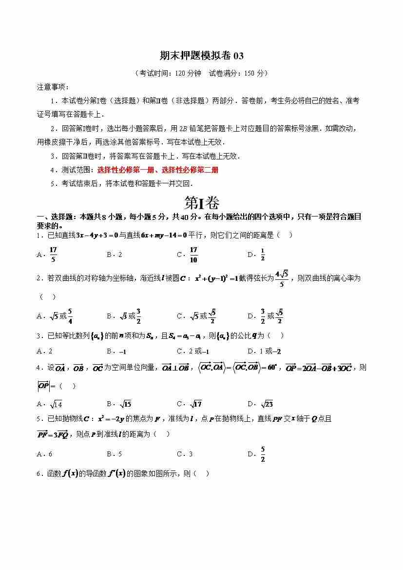 期末押题模拟卷03(测试范围:选择性必修第一册、选择性必修第二册)(学生版)