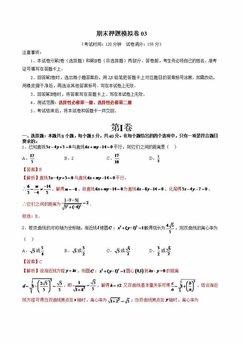 期末押题模拟卷03(测试范围:选择性必修第一册、选择性必修第二册)(教师版)
