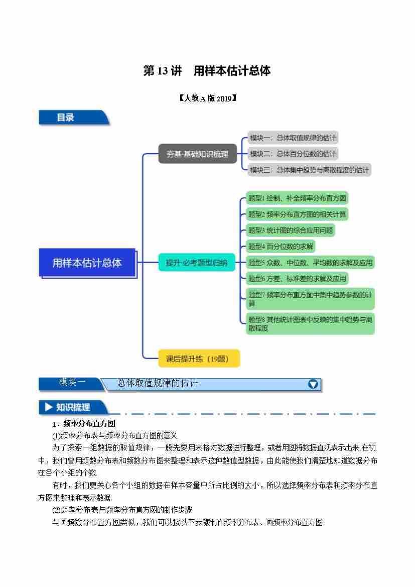 第13讲 用样本估计总体(春季讲义)(人教A版2019必修第二册)(学生版)