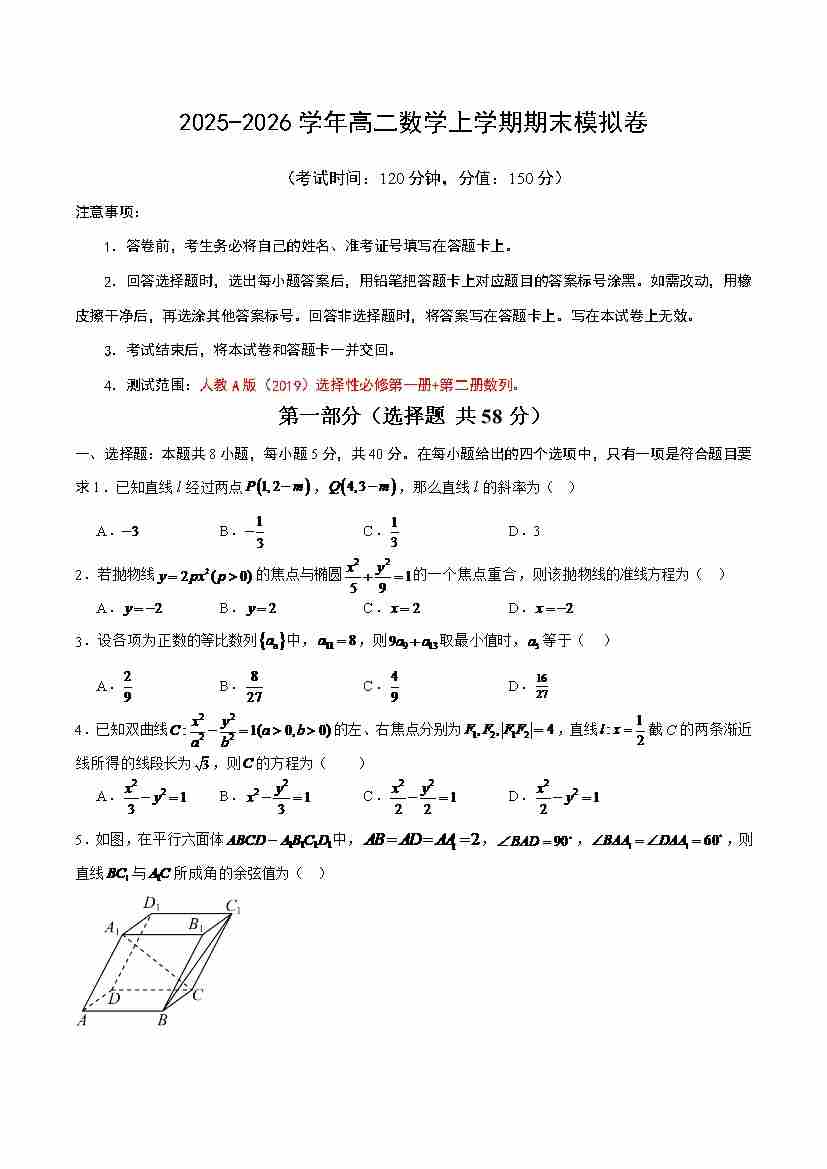高二数学上学期期末模拟卷(考试版A4)