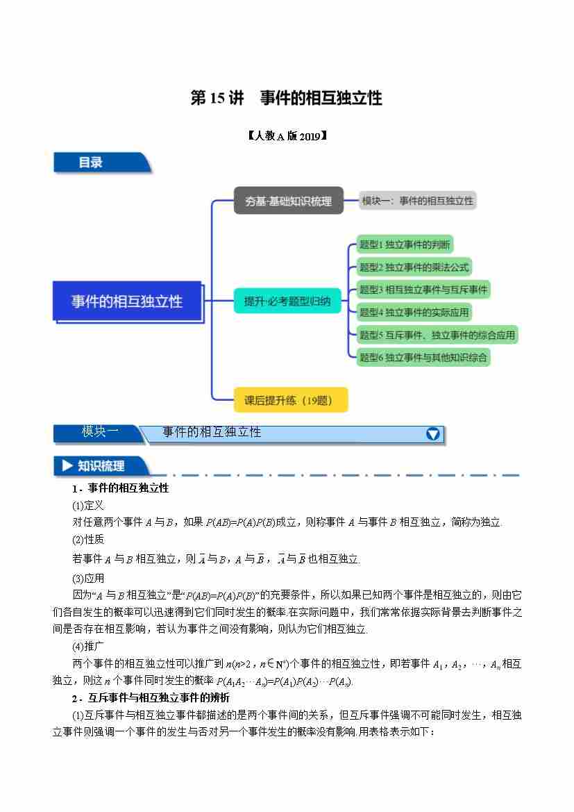 第15讲 事件的相互独立性(春季讲义)(人教A版2019必修第二册)(学生版)