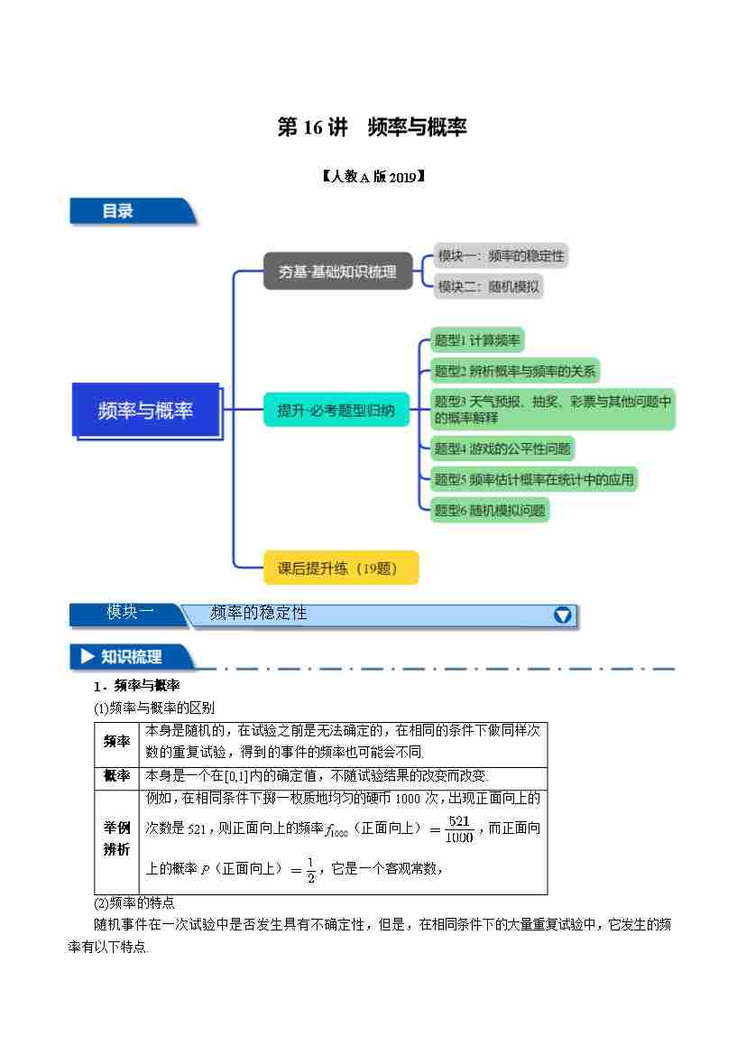 第16讲 频率与概率(春季讲义)(人教A版2019必修第二册)(学生版)