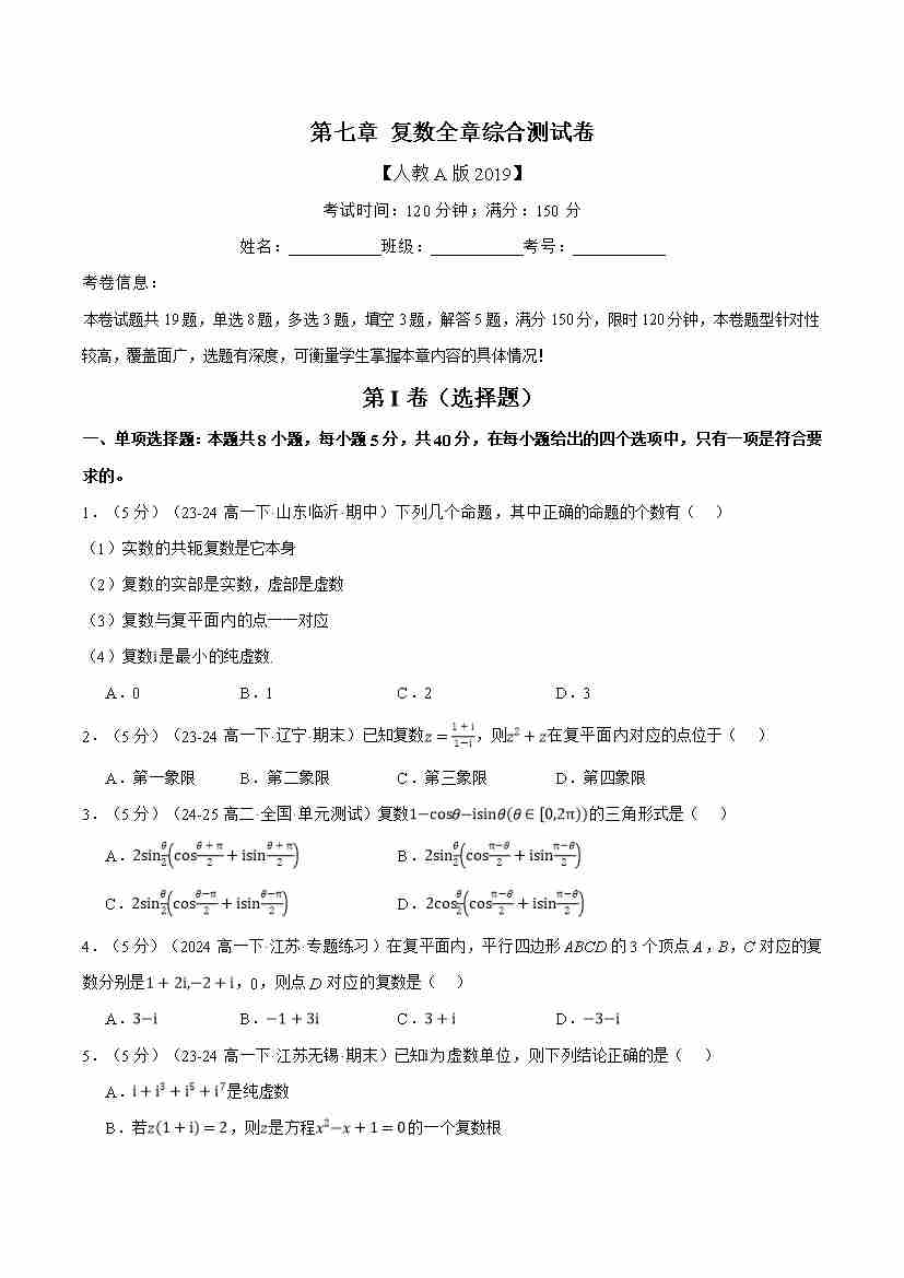 第七章 复数全章综合测试卷(人教A版2019必修第二册)(学生版)