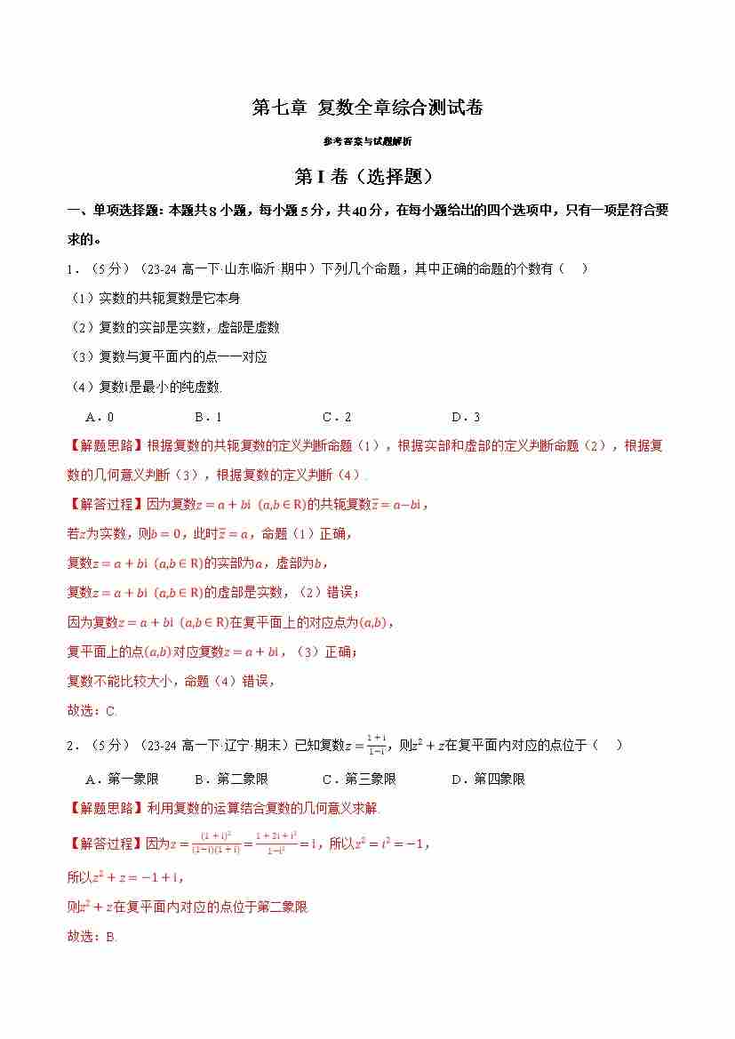 第七章 复数全章综合测试卷(人教A版2019必修第二册)(教师版)