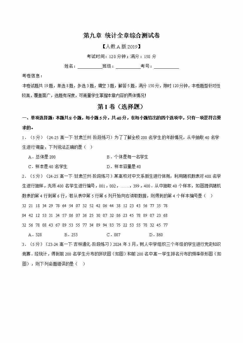 第九章 统计全章综合测试卷(人教A版2019必修第二册)(学生版)