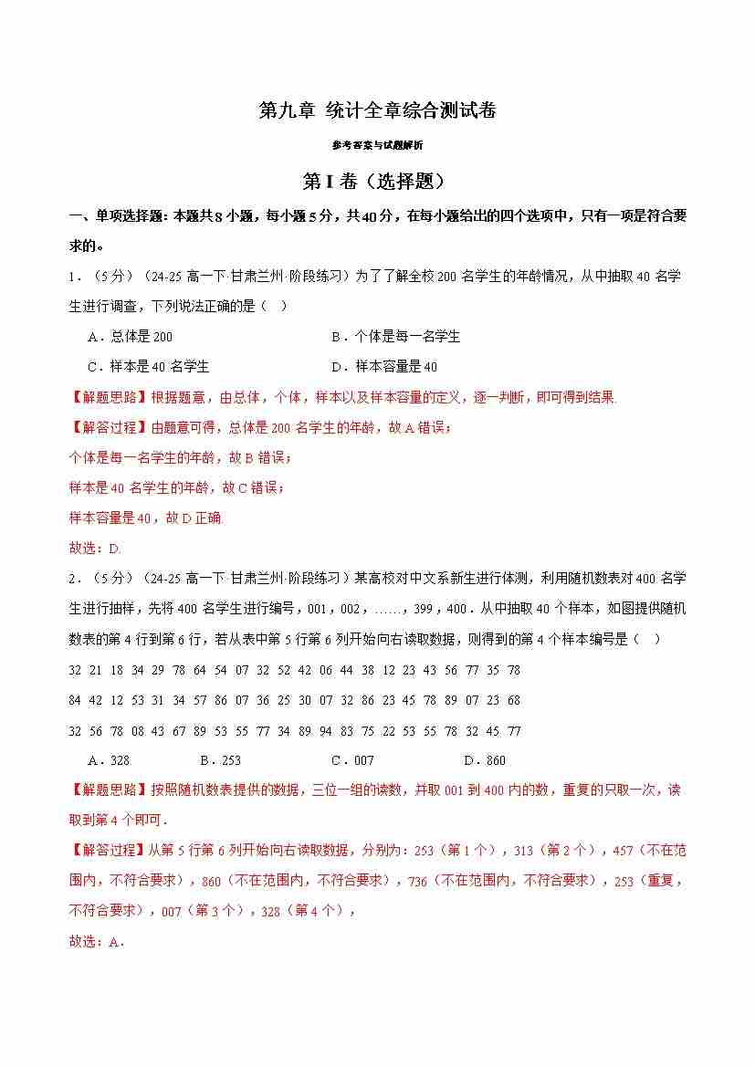 第九章 统计全章综合测试卷(人教A版2019必修第二册)(教师版)