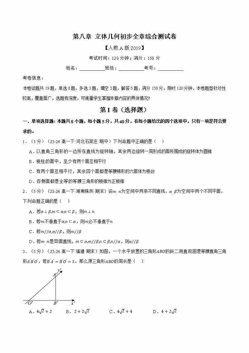 第八章 立体几何初步全章综合测试卷(人教A版2019必修第二册)(学生版)