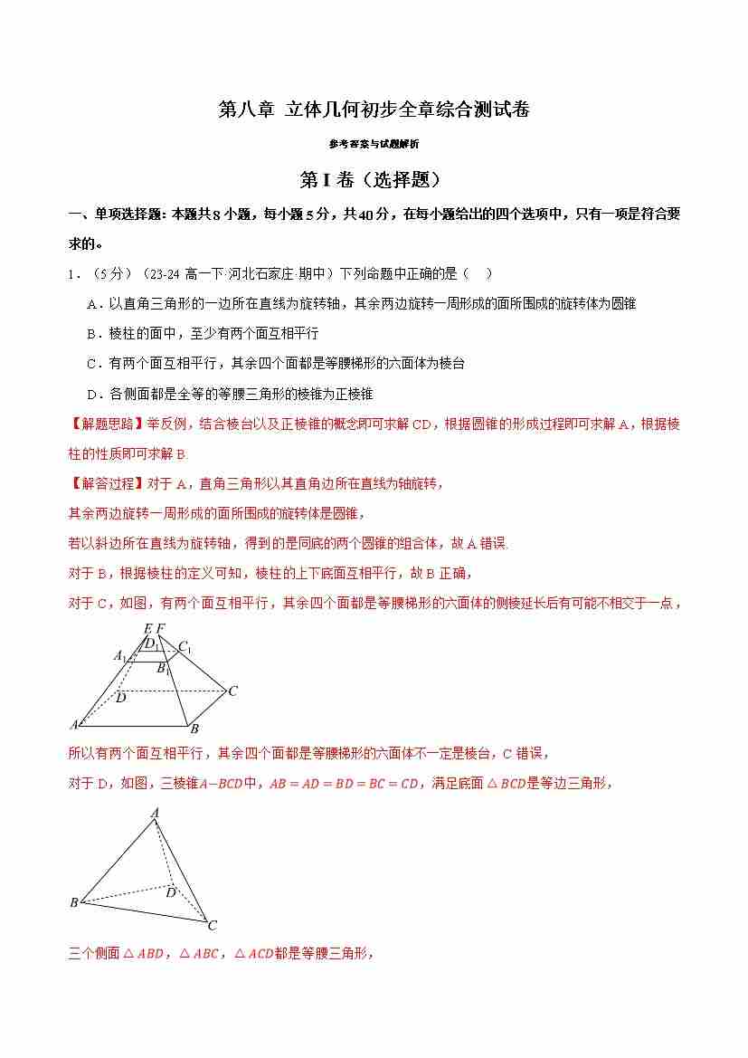 第八章 立体几何初步全章综合测试卷(人教A版2019必修第二册)(教师版)