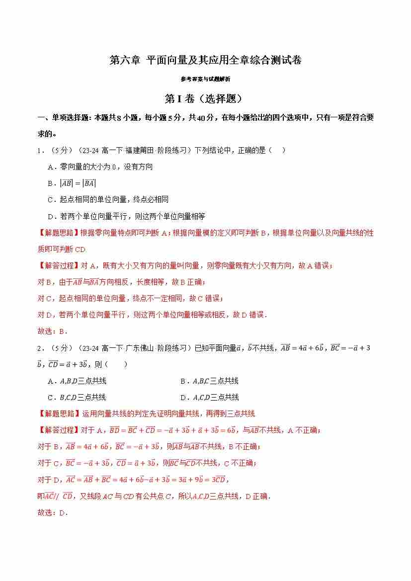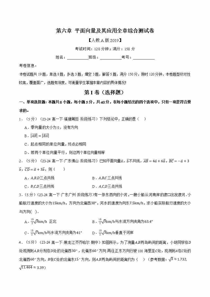 第六章 平面向量及其应用全章综合测试卷(人教A版2019必修第二册)(学生版)