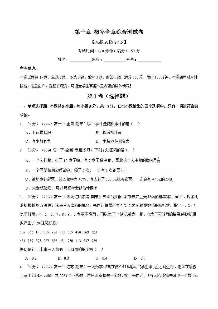第十章 概率全章综合测试卷(人教A版2019必修第二册)(学生版)