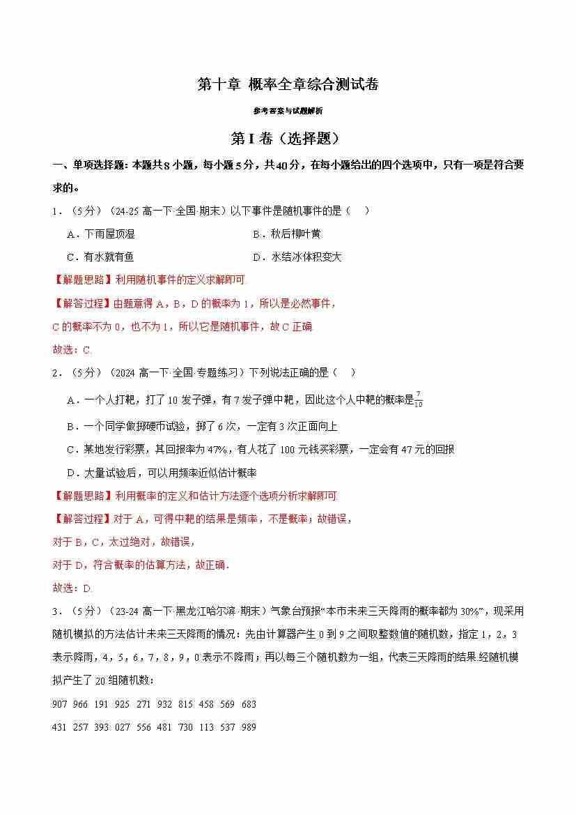 第十章 概率全章综合测试卷(人教A版2019必修第二册)(教师版)