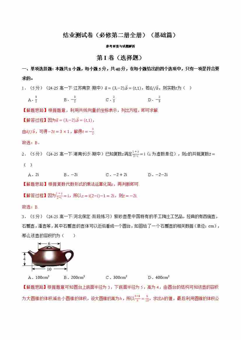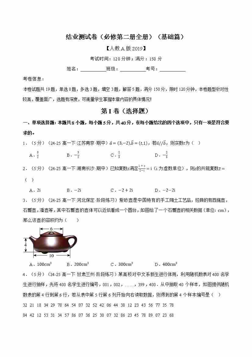 结业测试卷(必修第二册全册)(基础篇)(人教A版2019必修第二册)(教师版)