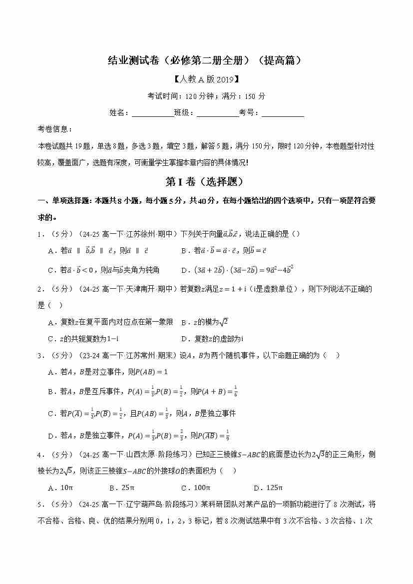 结业测试卷(必修第二册全册)(提高篇)(人教A版2019必修第二册)(学生版)