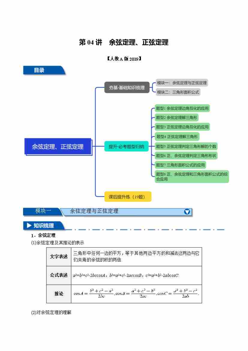 第04讲 余弦定理、正弦定理(春季讲义)(人教A版2019必修第二册)(学生版)