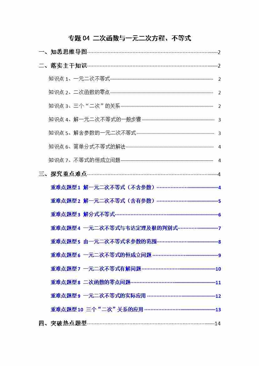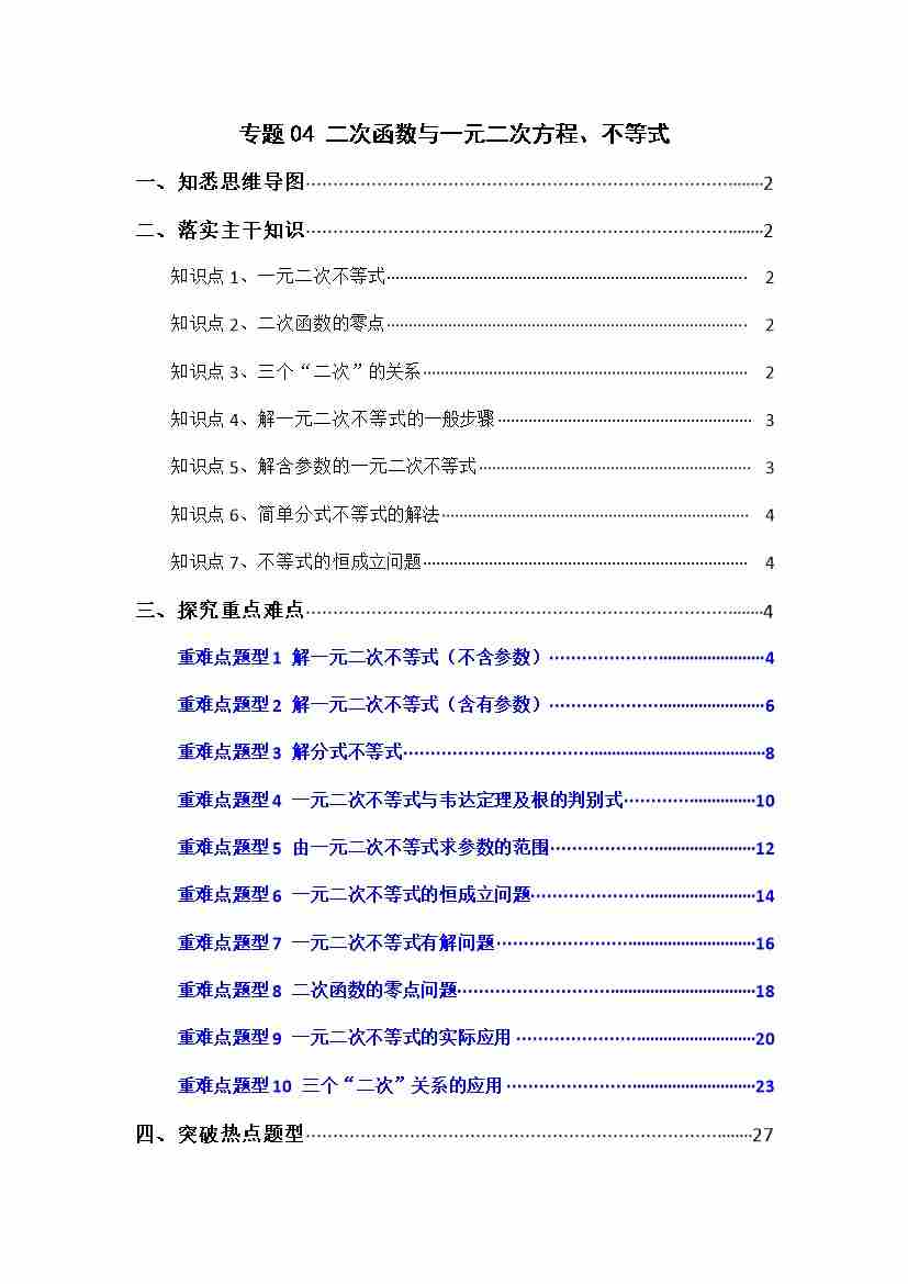 专题04 二次函数与一元二次方程、不等式(十大考点精讲)学生版