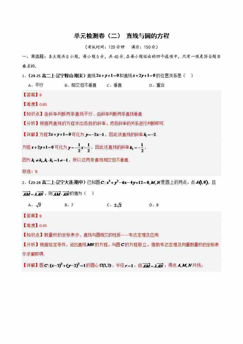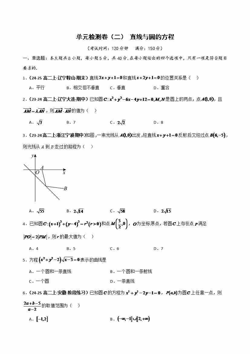 单元检测卷(二)直线与圆的方程(学生版)
