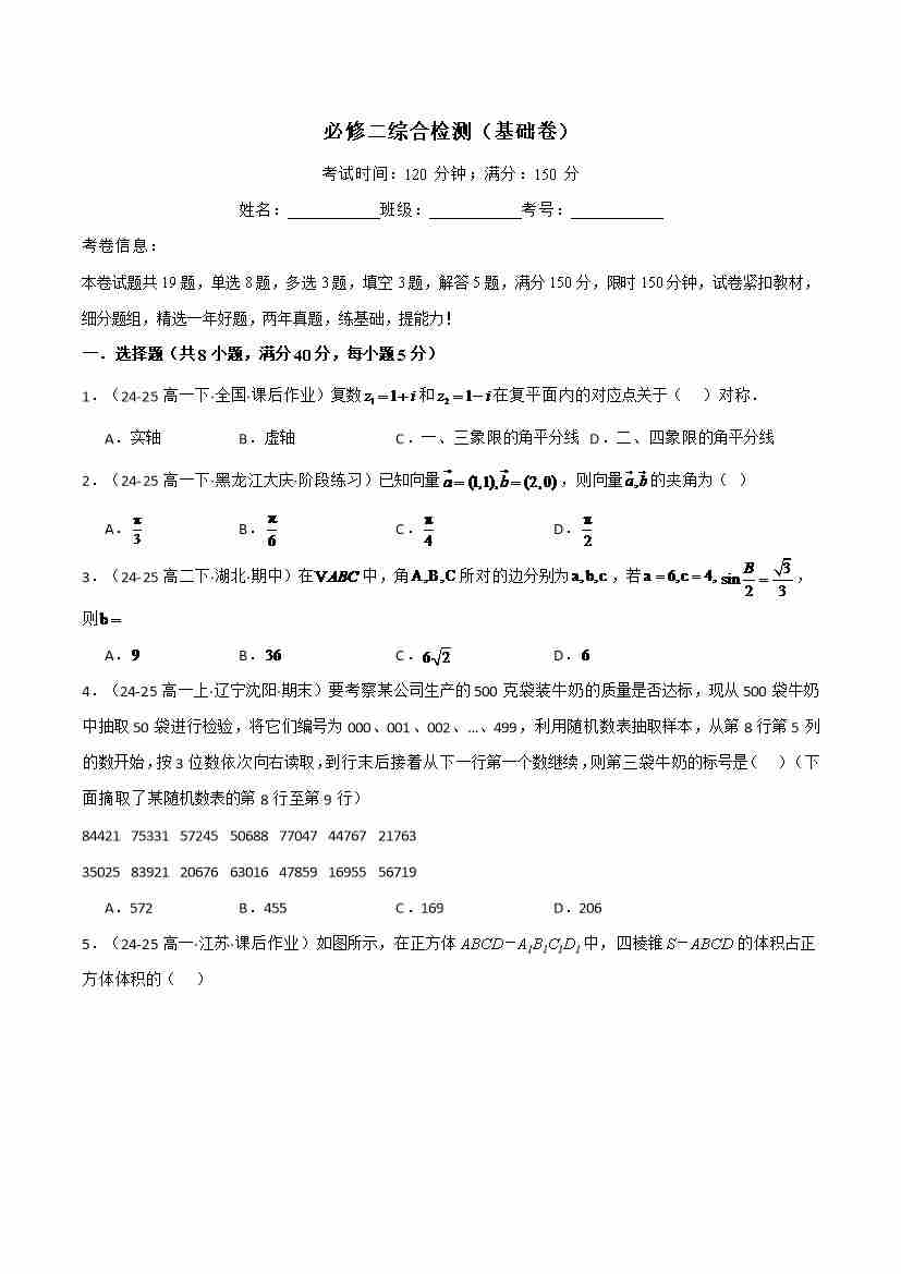 必修二综合检测(基础卷)(人教A版2019必修第二册)(学生版)