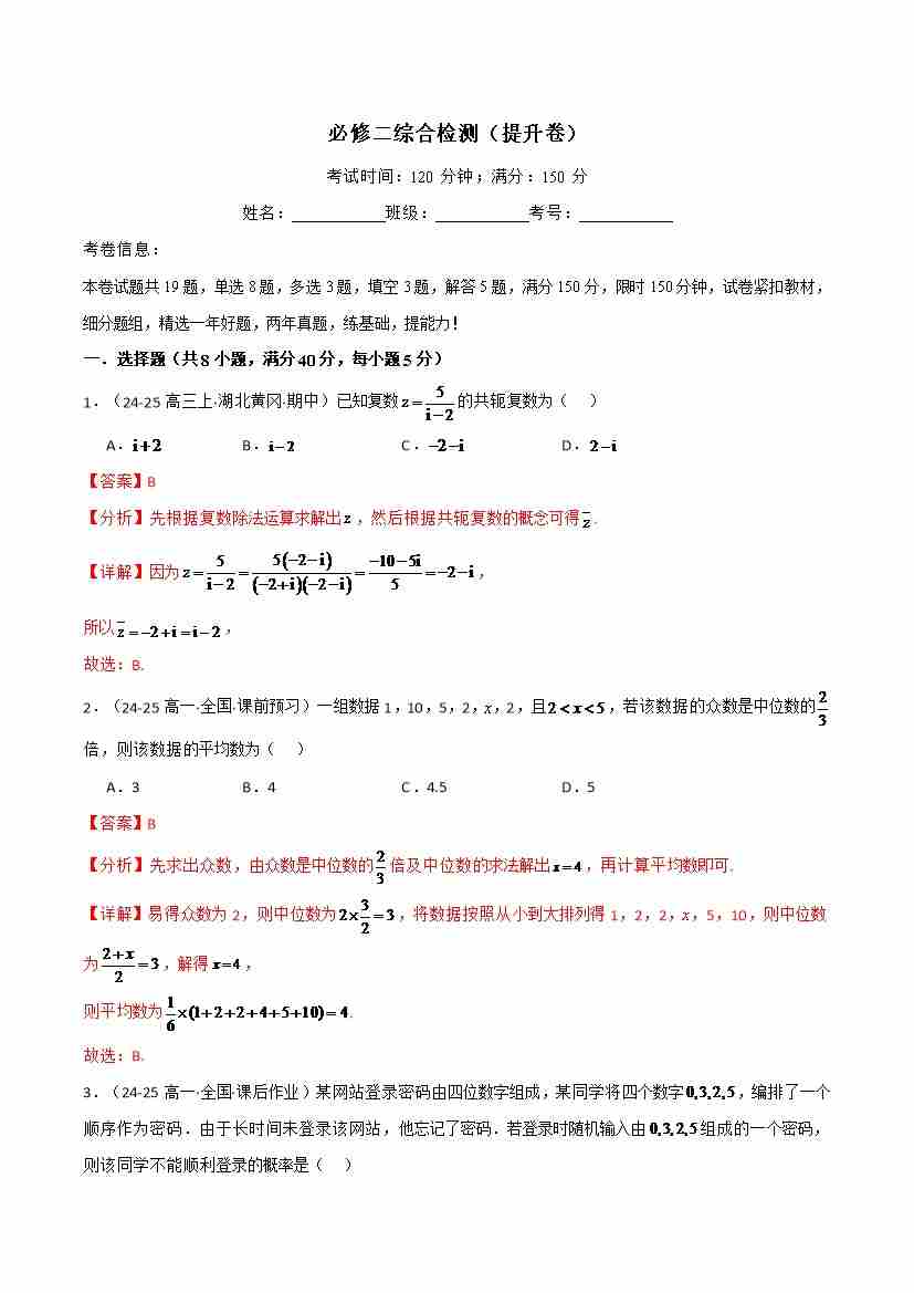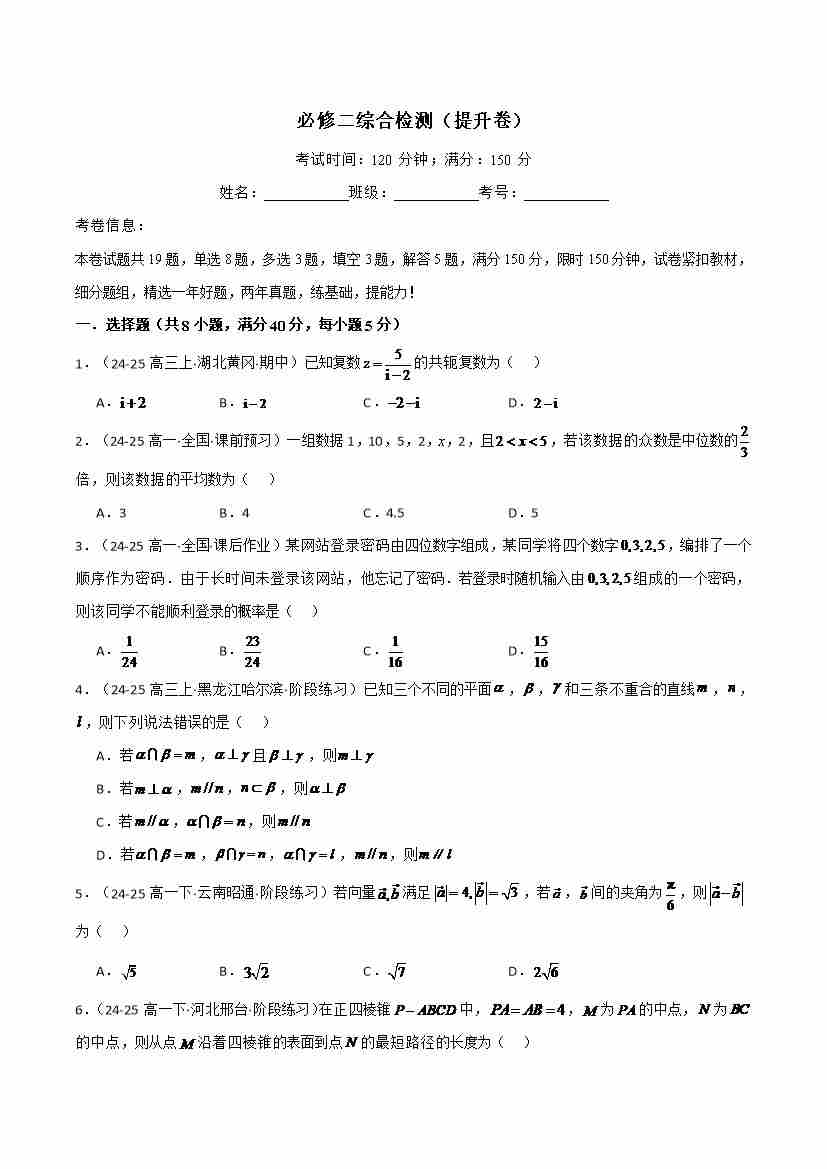 必修二综合检测(提升卷)(人教A版2019必修第二册)(学生版)
