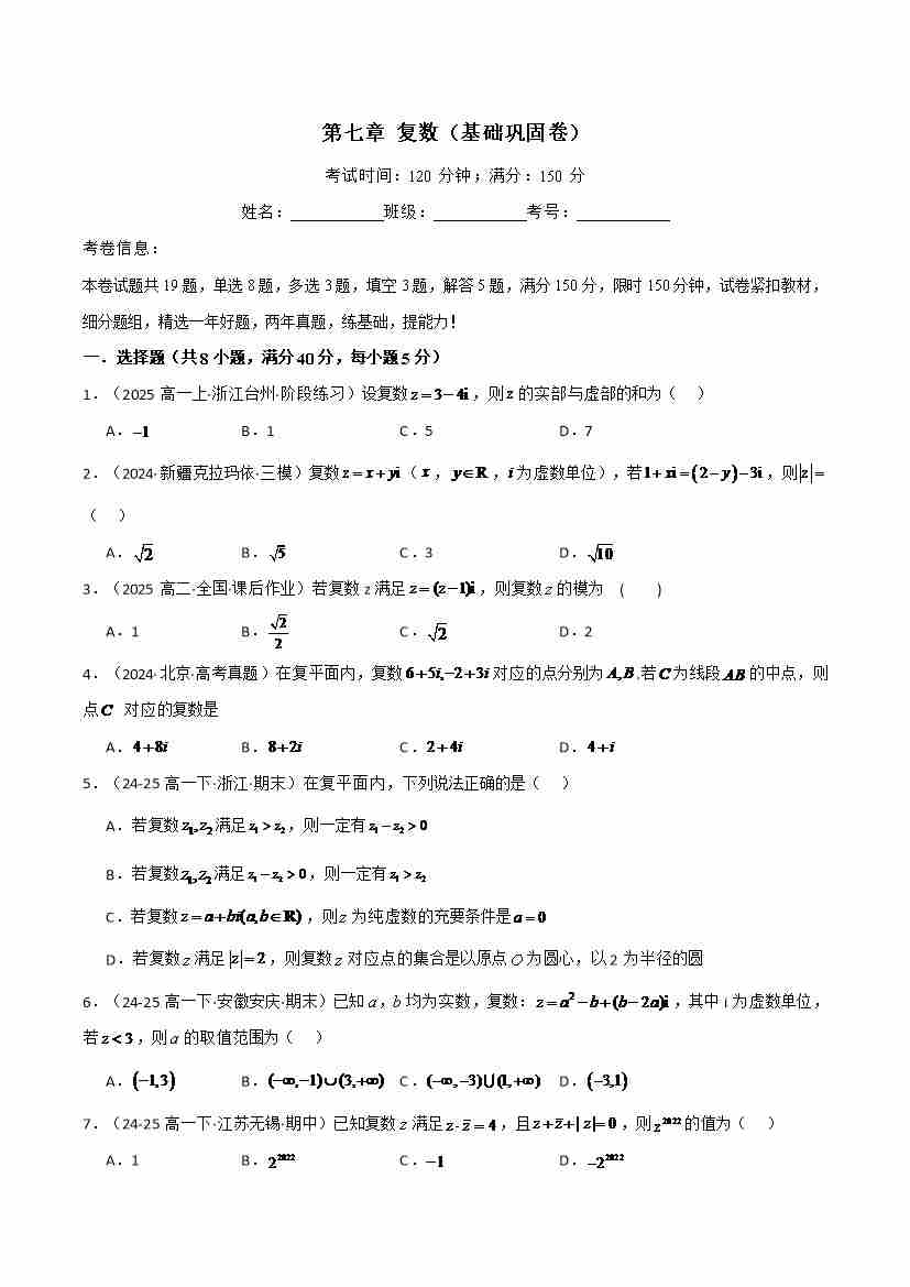 第七章 复数(基础巩固卷)(人教A版2019必修第二册)(学生版)