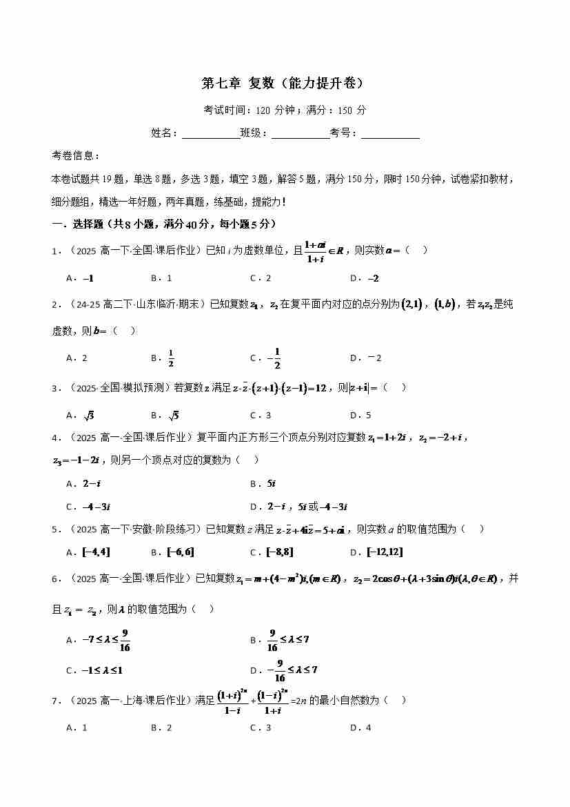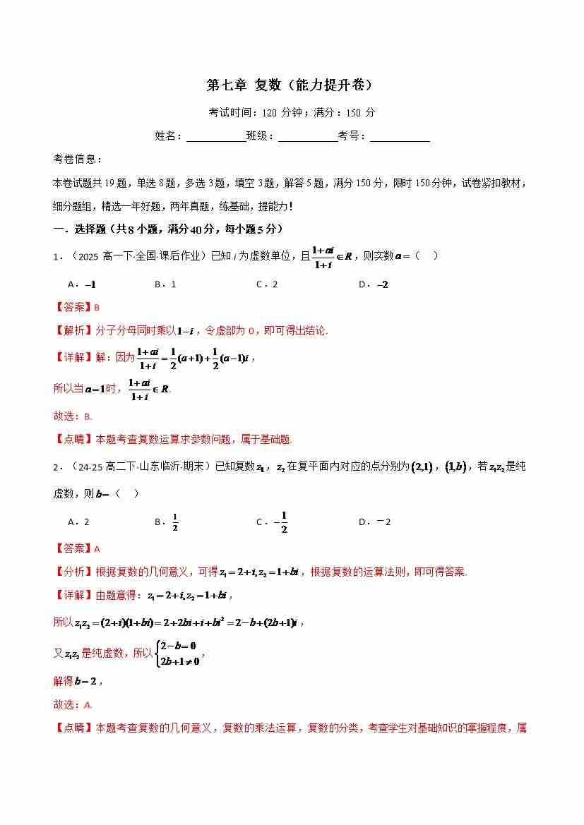 第七章 复数(能力提升卷)(人教A版2019必修第二册)(学生版)