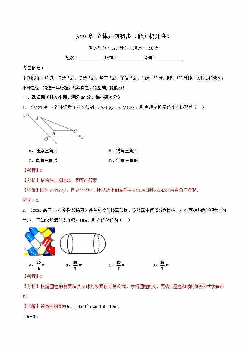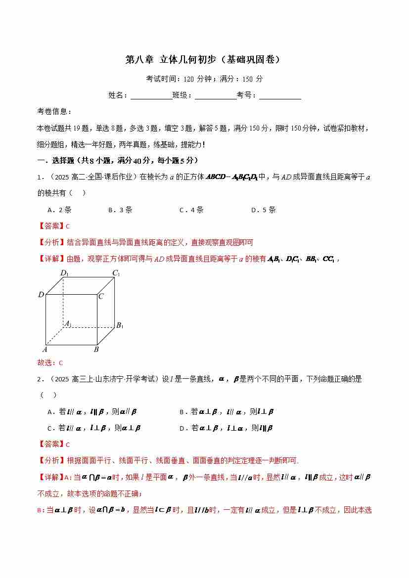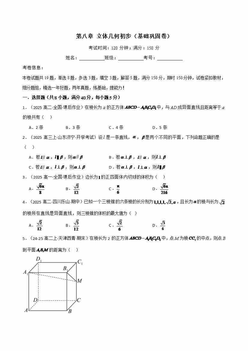 第八章 立体几何初步(基础巩固卷)(人教A版2019必修第二册)(学生版)