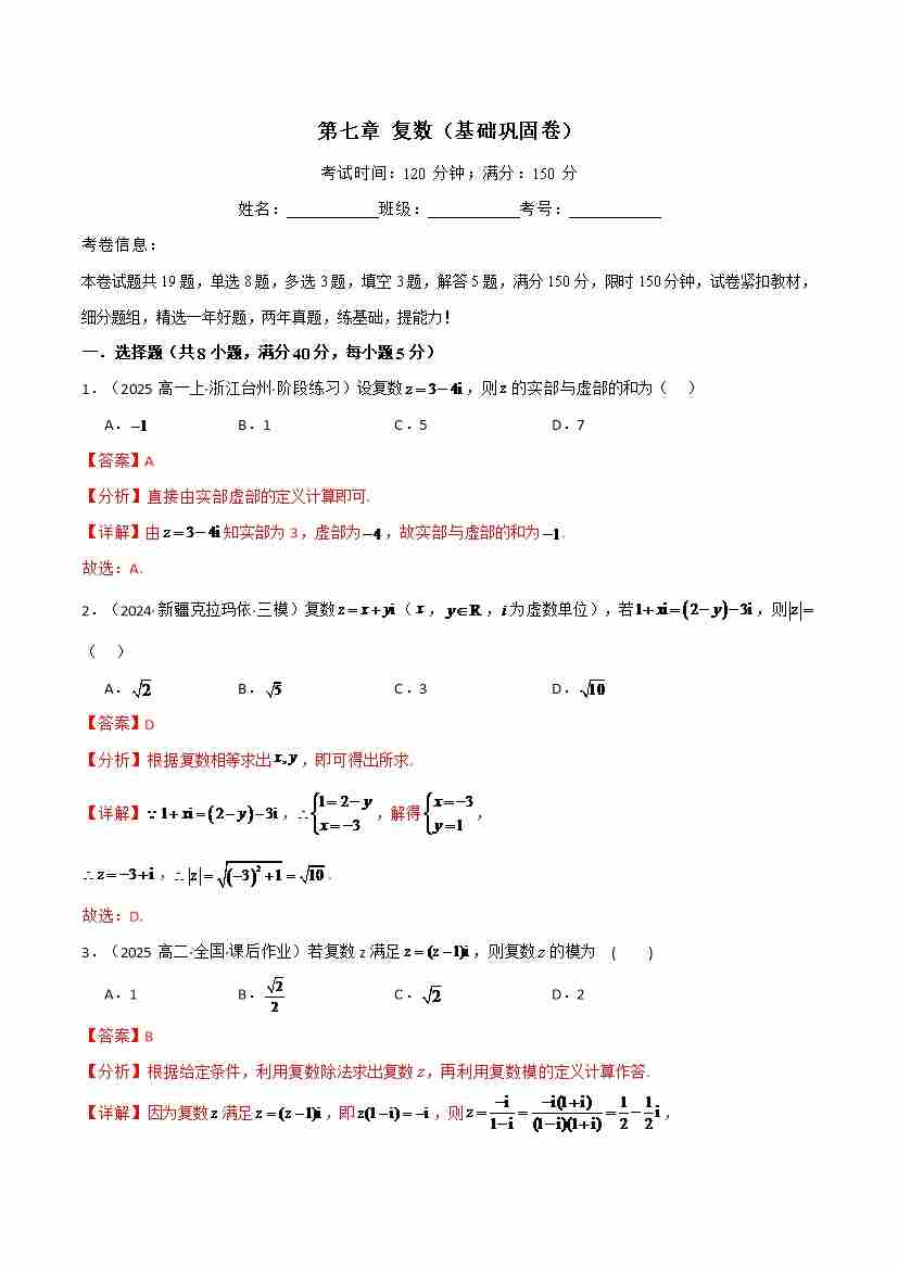 第七章 复数(基础巩固卷)(人教A版2019必修第二册)(教师版)