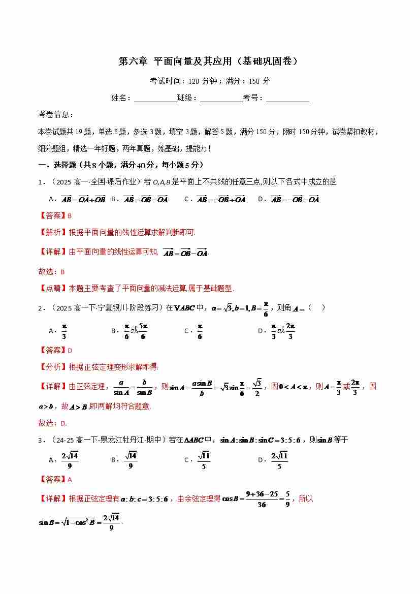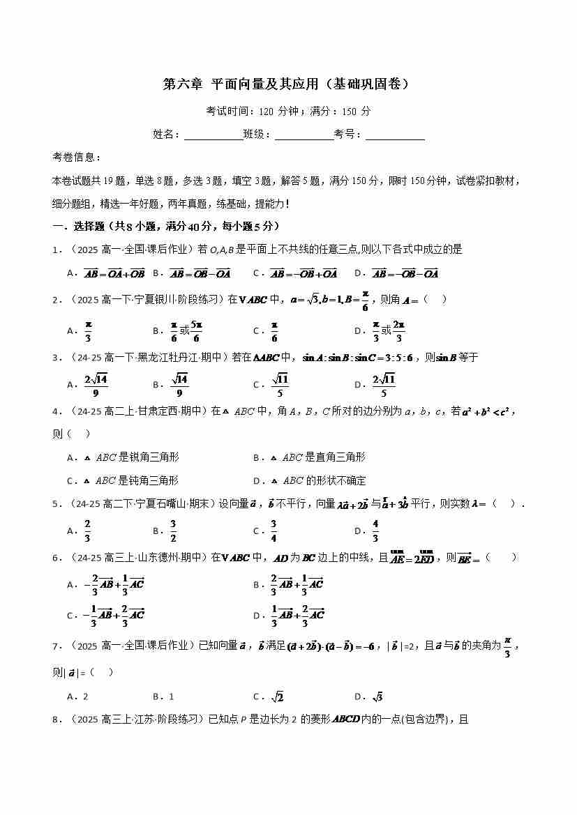 第六章 平面向量及其应用(基础巩固卷)(人教A版2019必修第二册)(学生版)