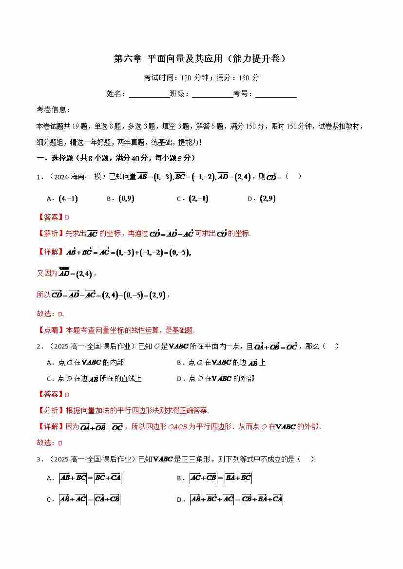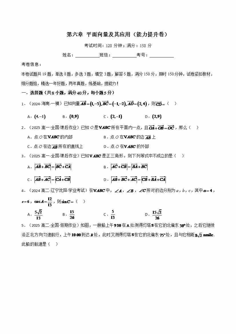 第六章 平面向量及其应用(能力提升卷)(人教A版2019必修第二册)(学生版)