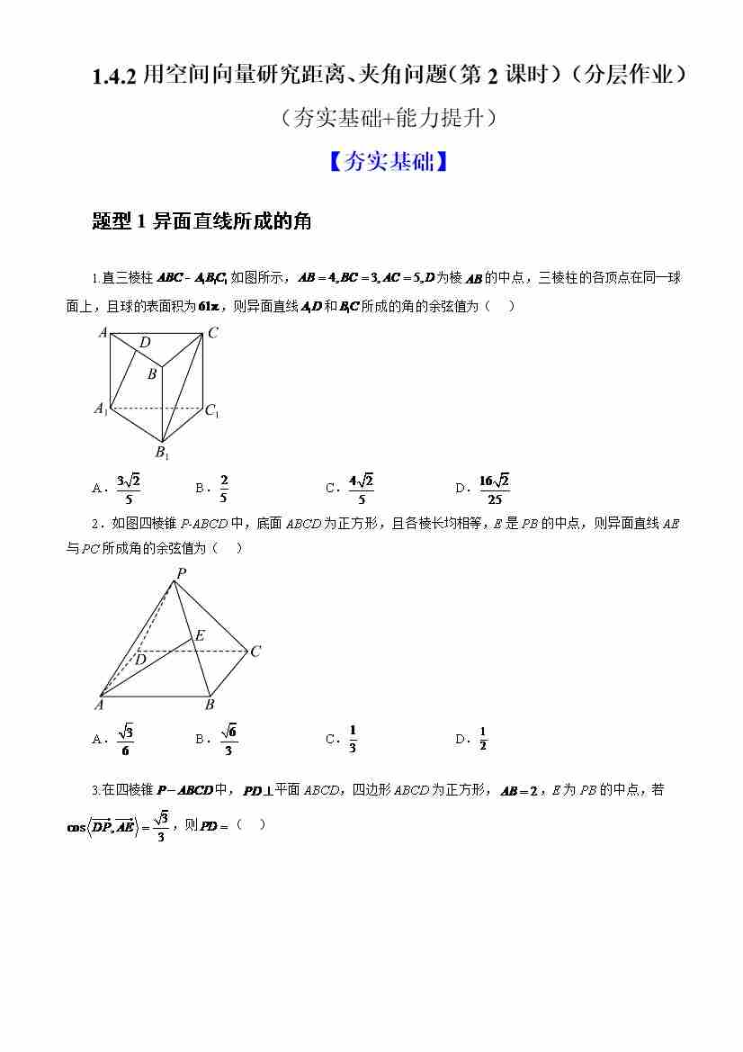 1.4.2用空间向量研究距离、夹角问题(第2课时)(分层作业)(原卷版)-人教A版2019选择性必修第一册)