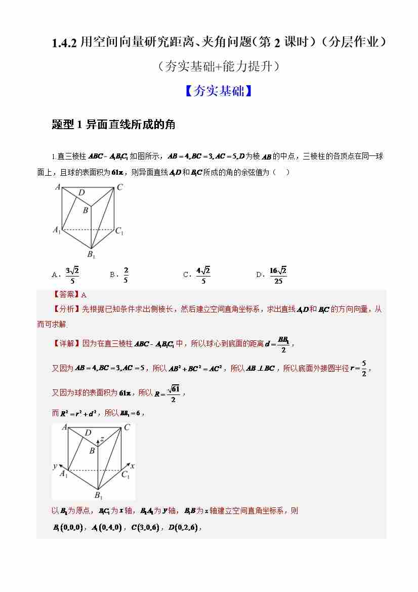 1.4.2用空间向量研究距离、夹角问题(第2课时)(分层作业)(解析版)-人教A版2019选择性必修第一册)